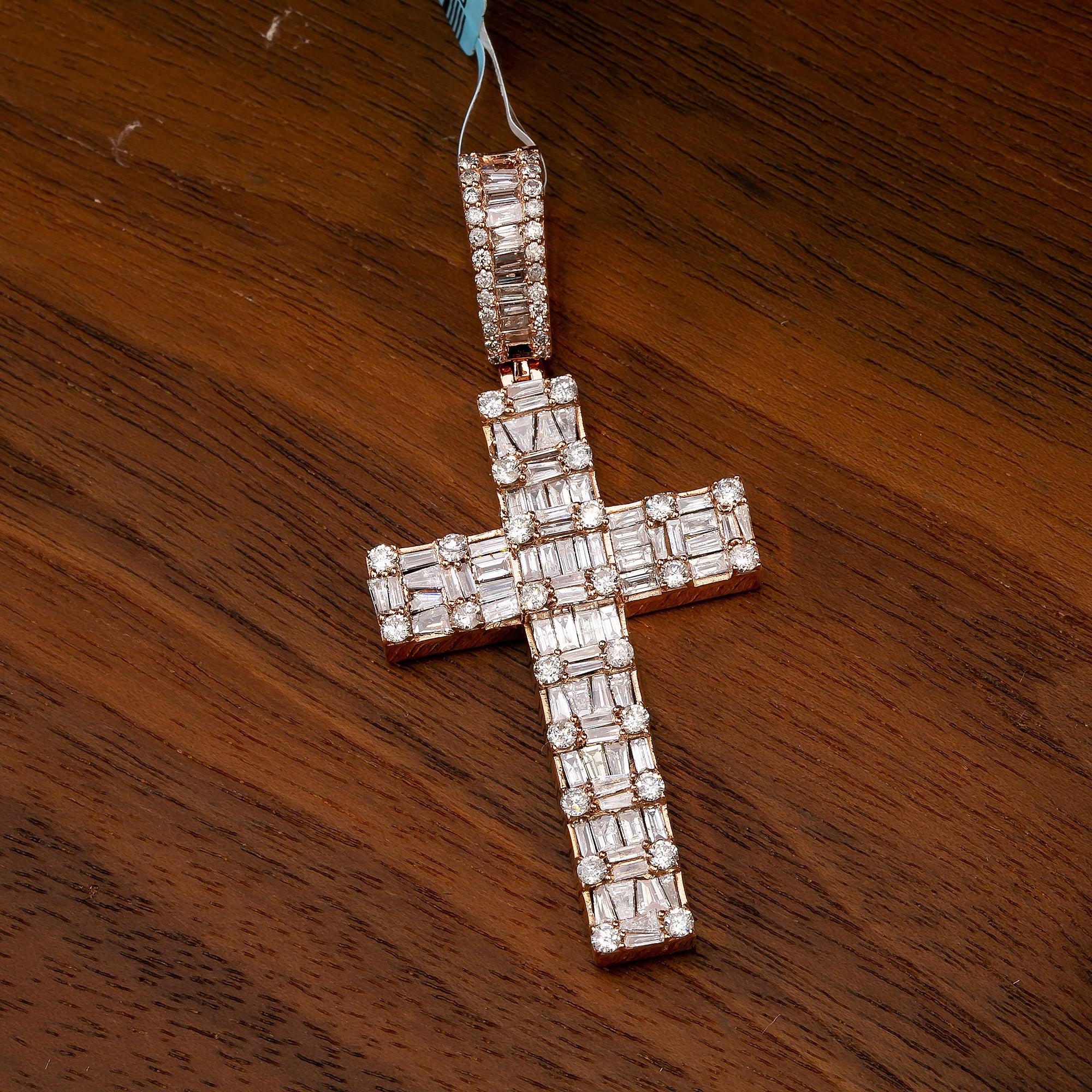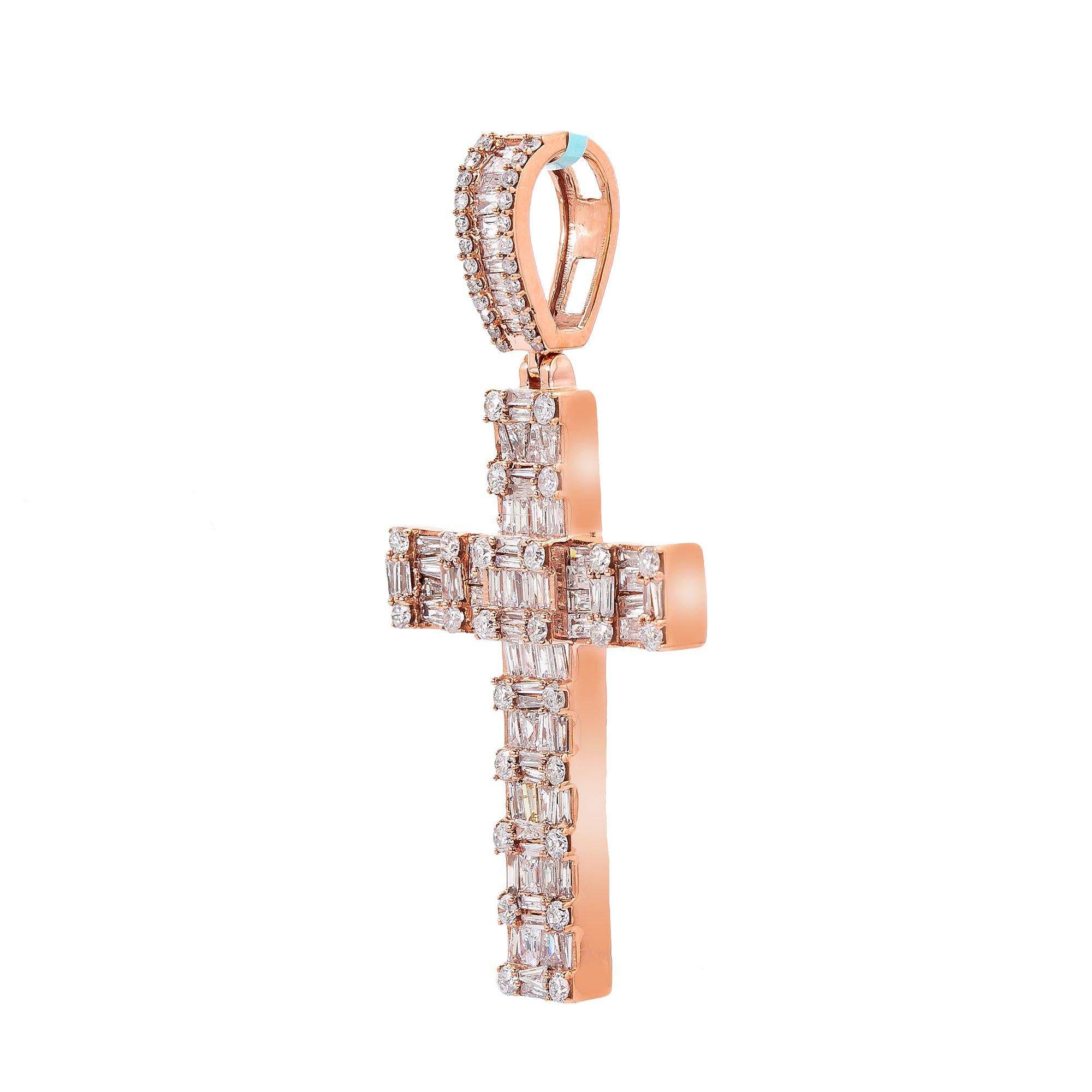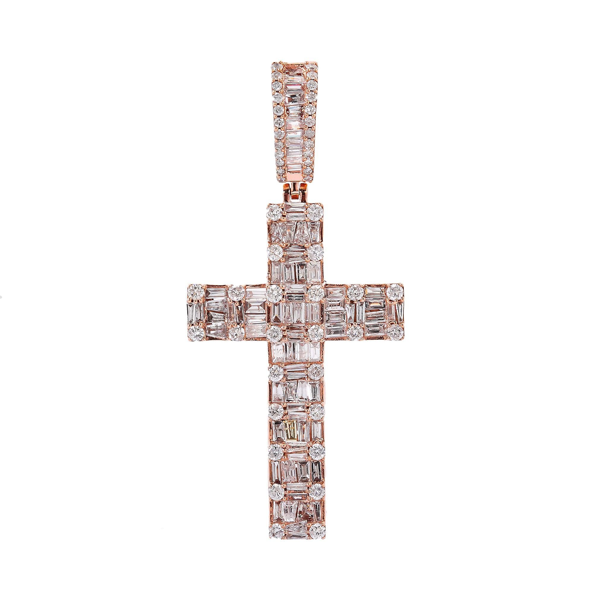 14K Rose Gold Cross Pendant with Round & Baguette Diamonds