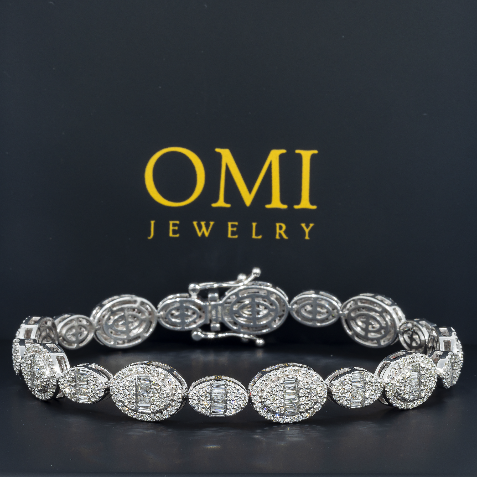 10K GOLD BAGUETTE AND ROUND DIAMONDS OVAL HALO BRACELET 5.98 CT