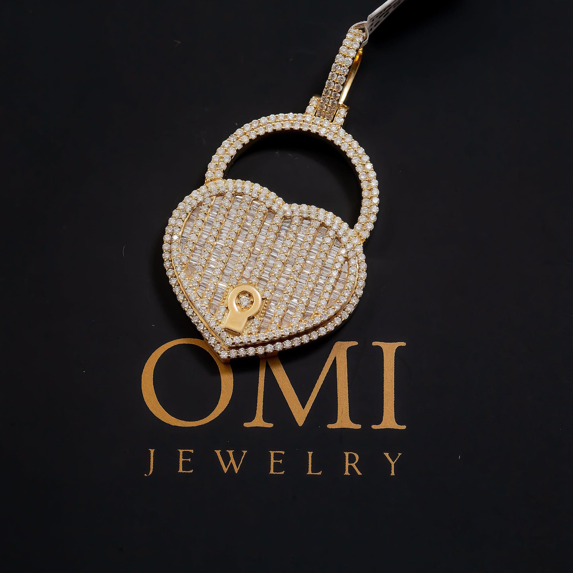 10K GOLD BAGUETTE AND ROUND DIAMOND HEART LOCK PENDANT 1.99 CT