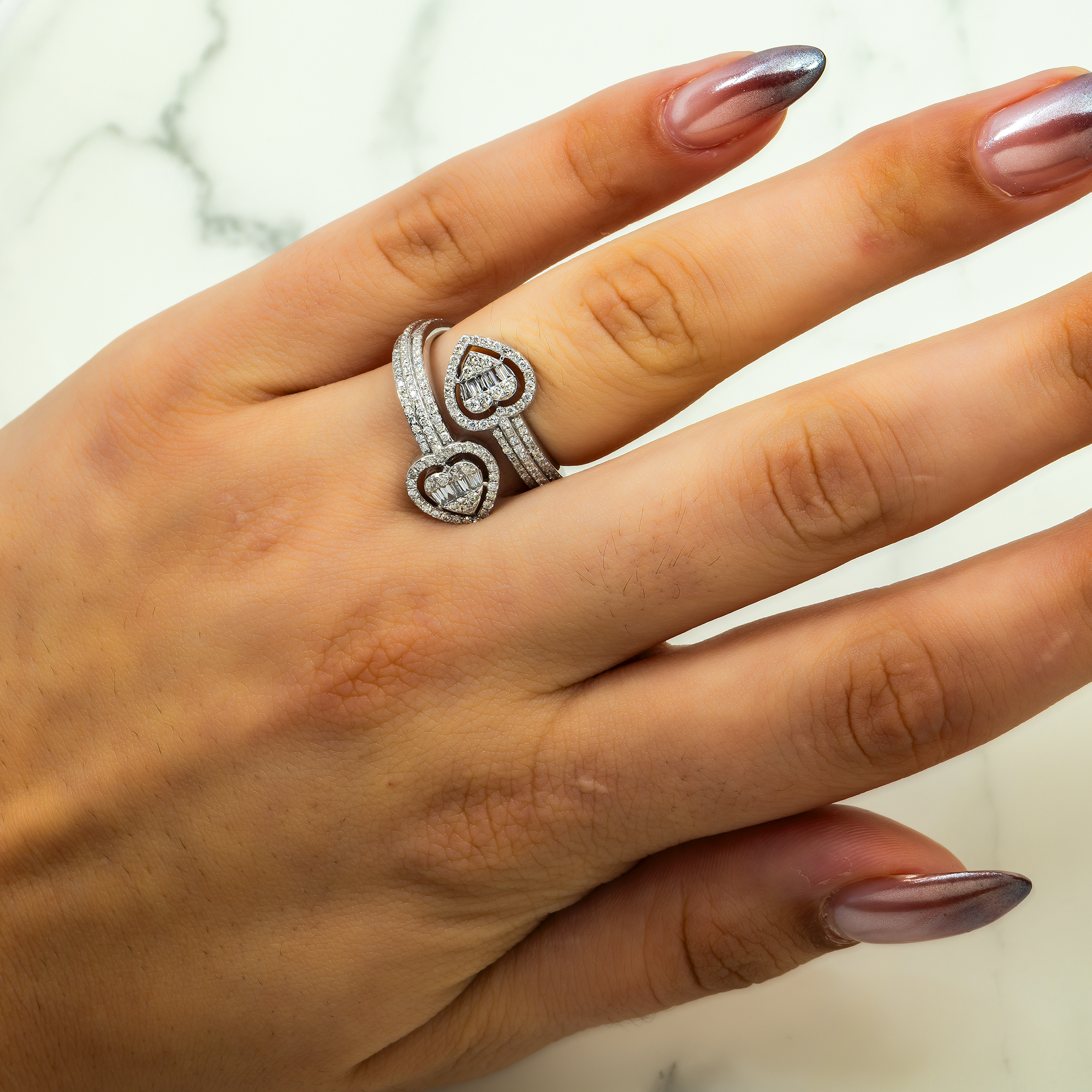 10K GOLD ROUND AND BAGUETTE DIAMOND HEART BYPASS RING 1.00 CT