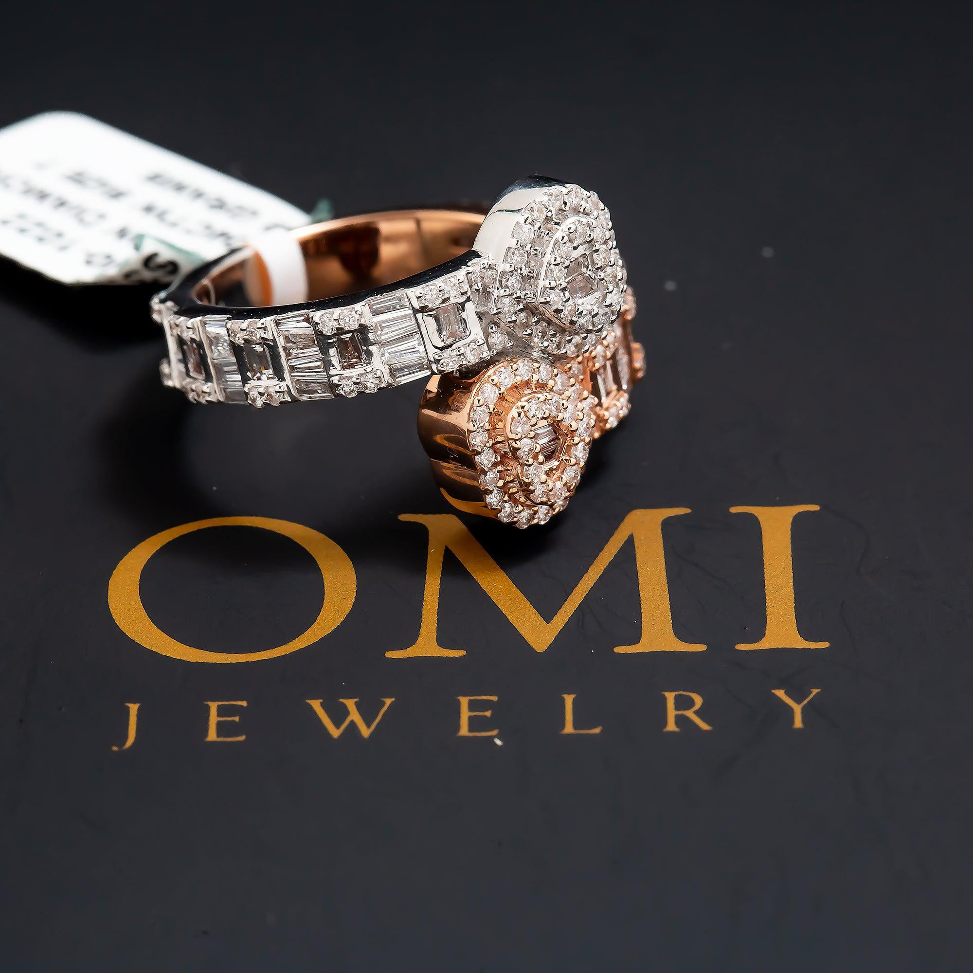 10K GOLD TWO TONE BAGUETTE AND ROUND DIAMOND DOUBLE HEART RING 1.04 CT