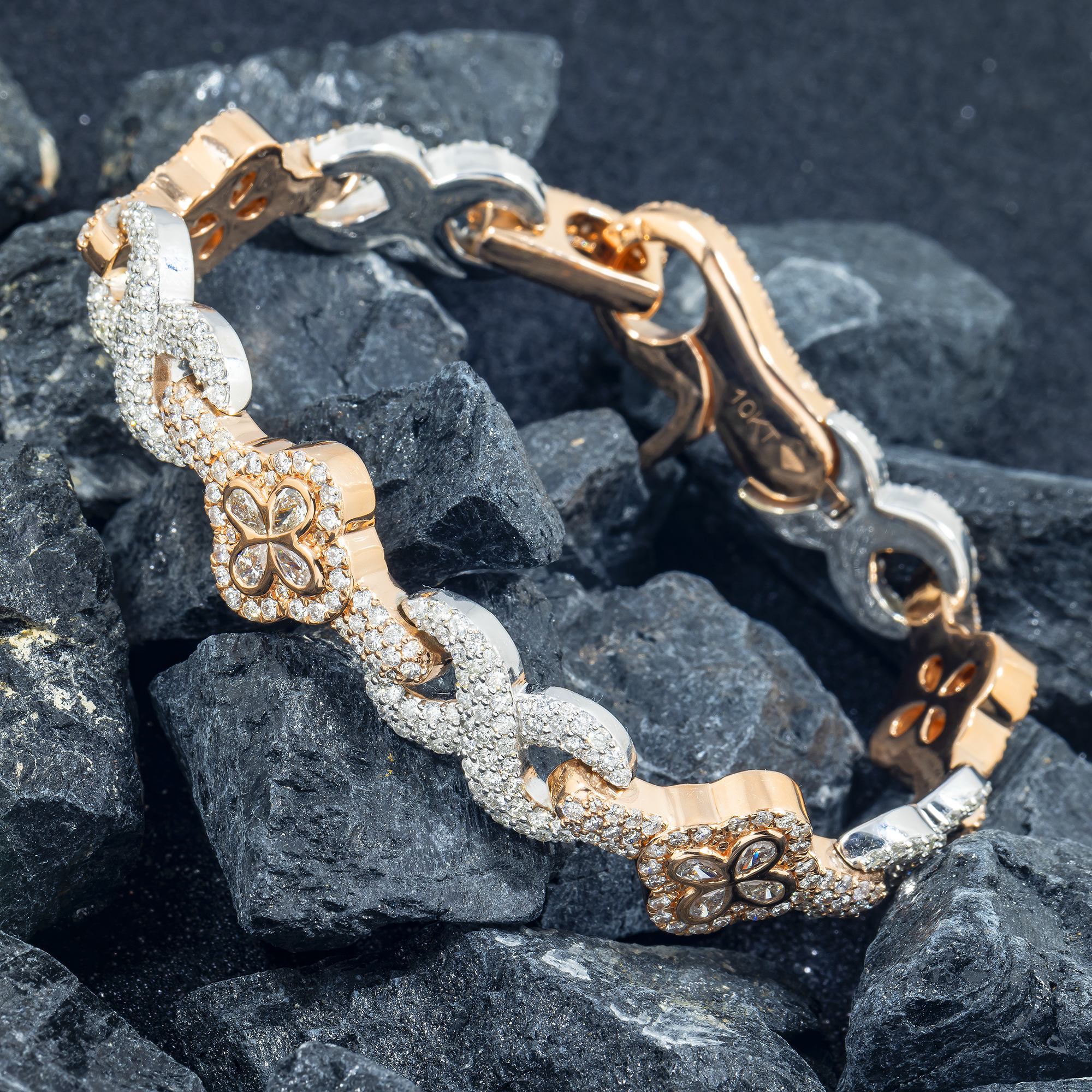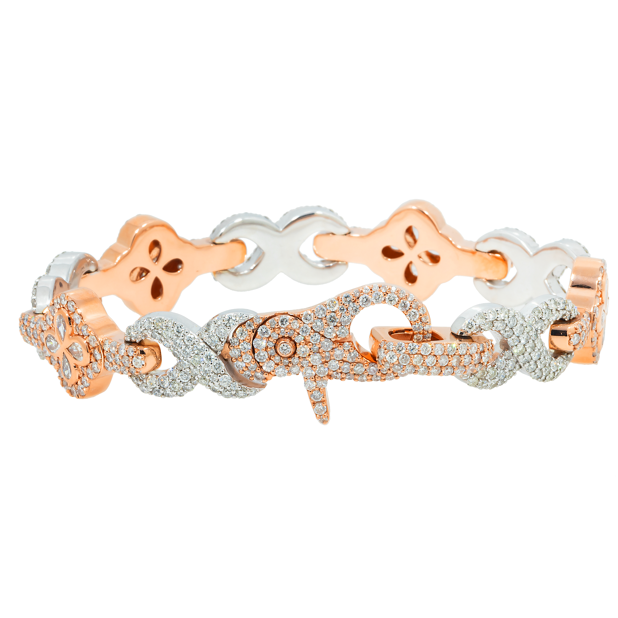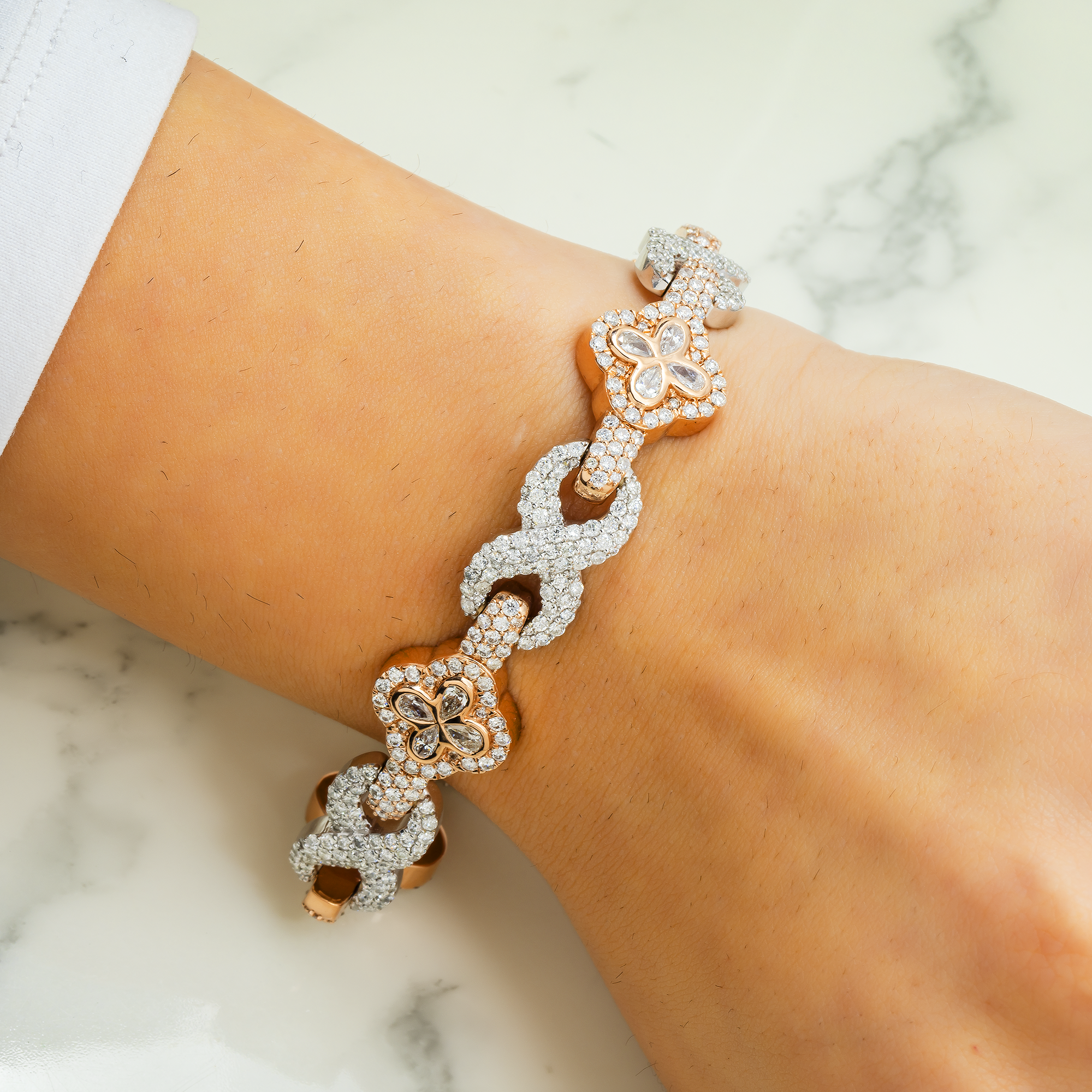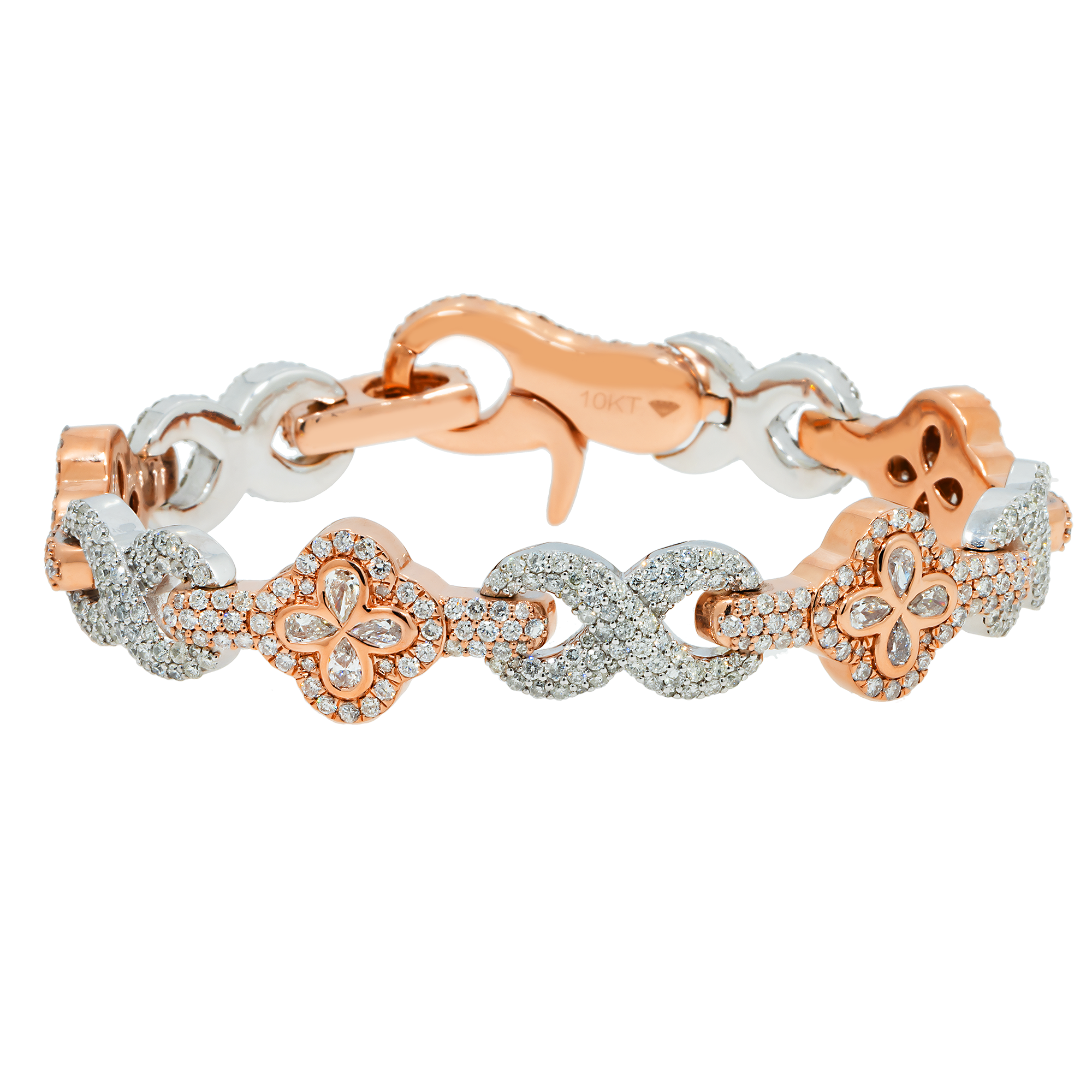10K GOLD TWO TONE ROUND AND PEAR DIAMONDS CLOVER INFINITY CHAIN BRACELET 12.05 CT