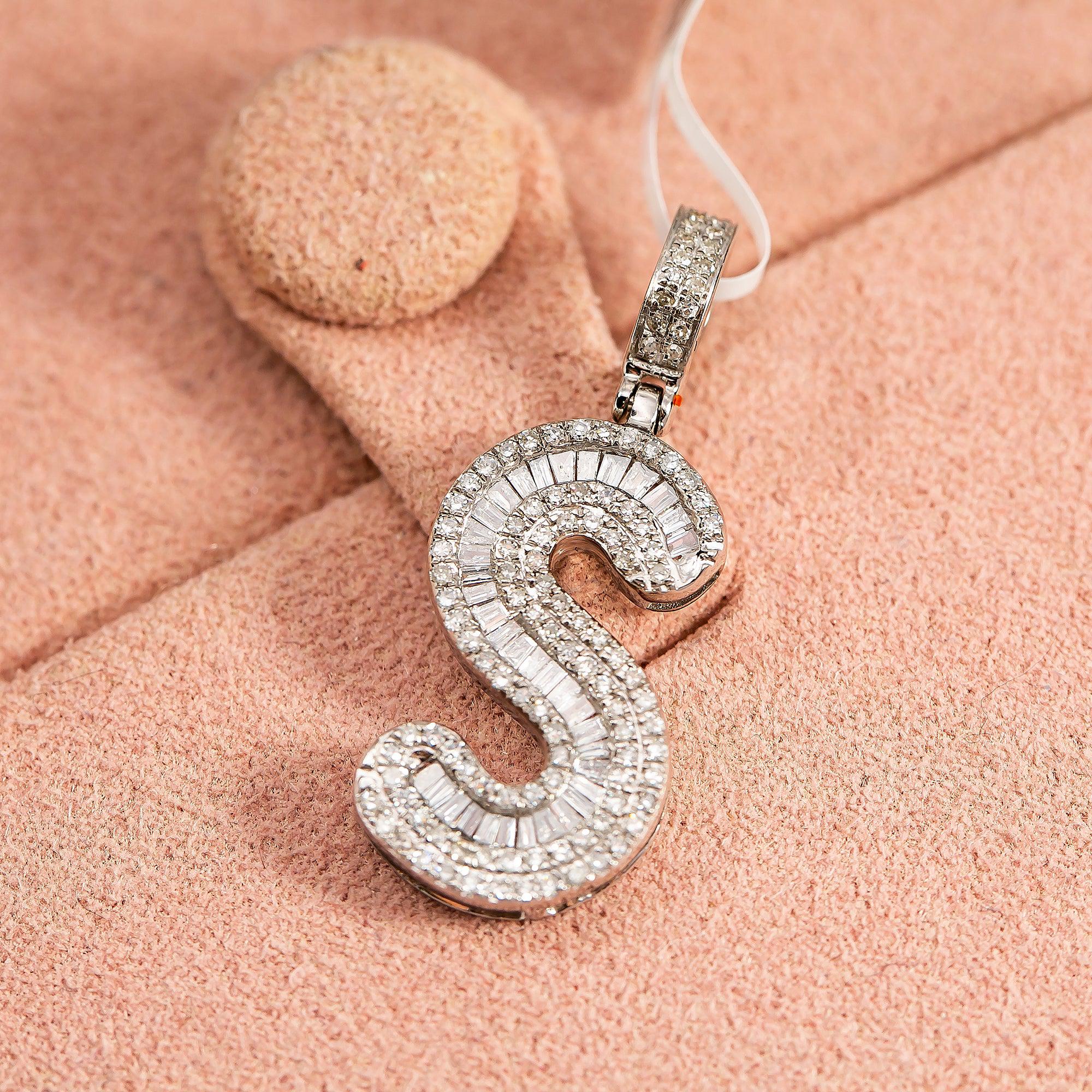 10K WHITE GOLD UNISEX LETTER S PENDANT WITH 1.1 CT BAGUETTE DIAMONDS