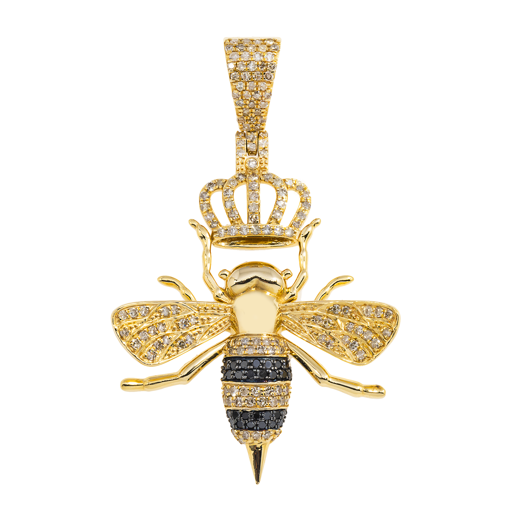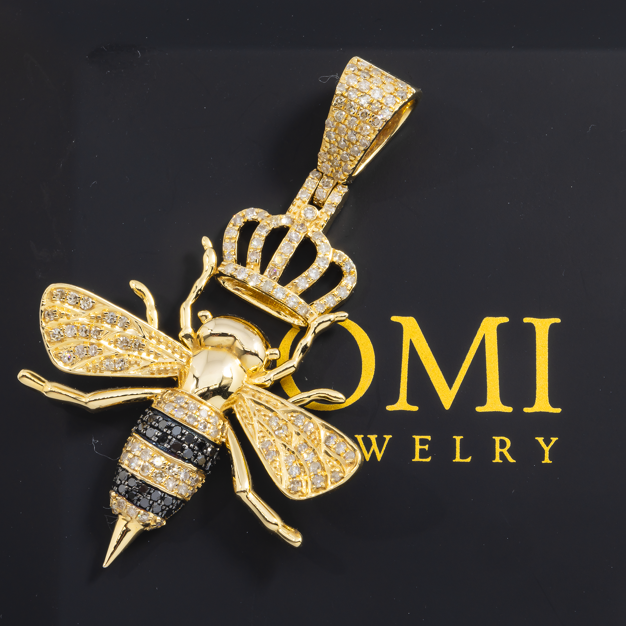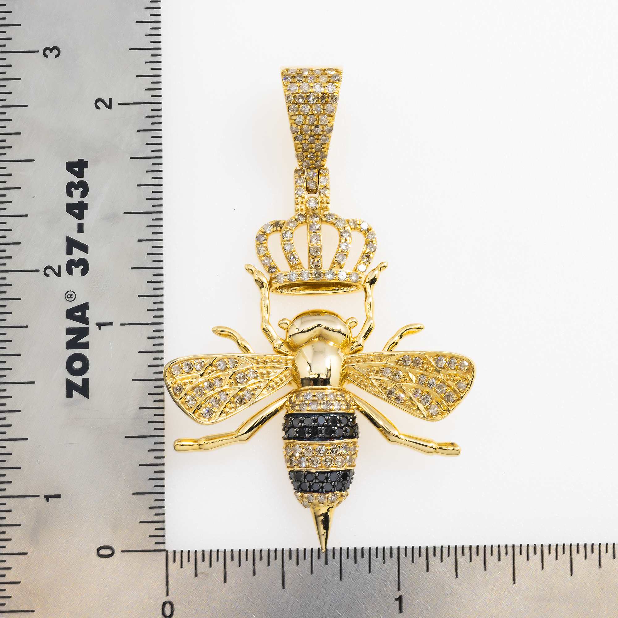 14K GOLD WHITE AND BLACK ROUND DIAMOND BEE WITH CROWN PENDANT 1.69 CT