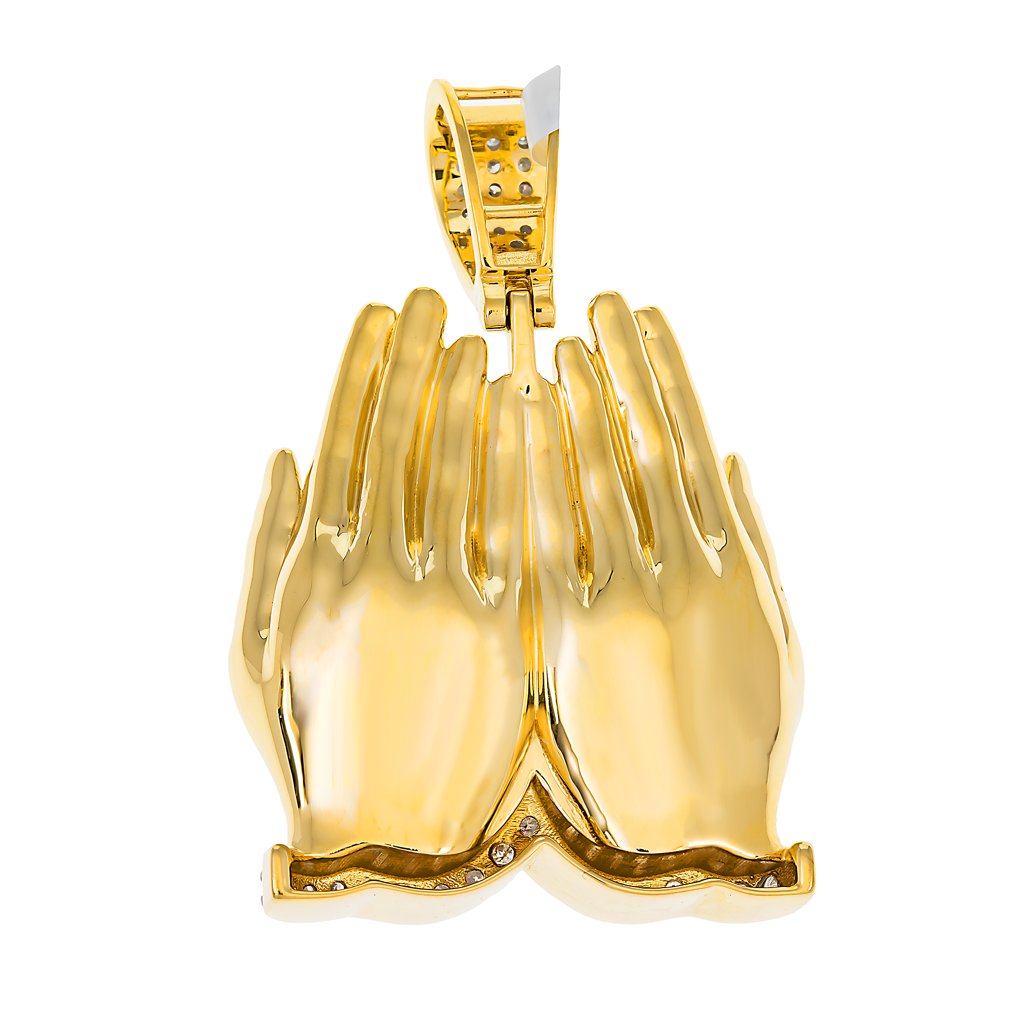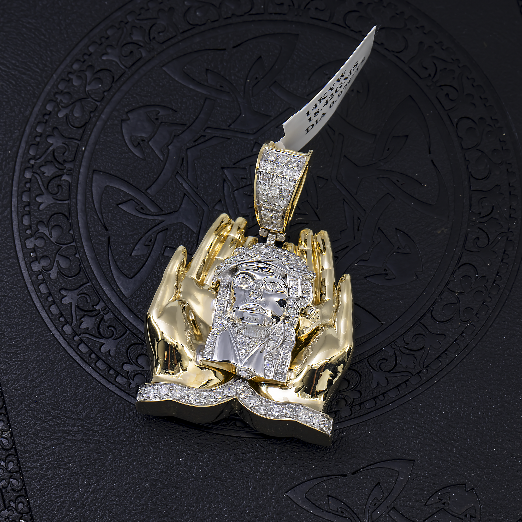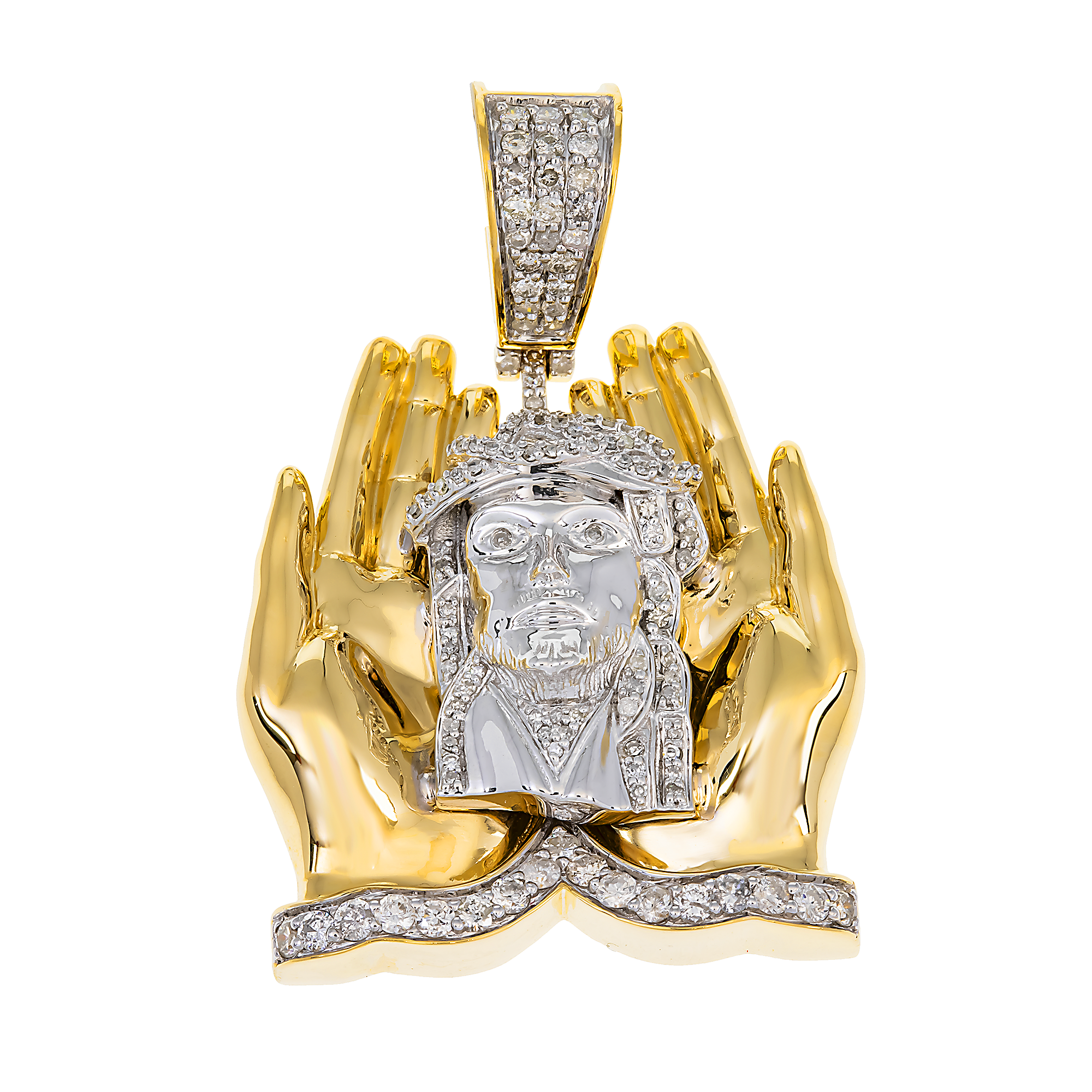 14K GOLD TWO TONE DIAMOND JESUS HEAD IN PRAYING HANDS PENDANT 0.97 CT