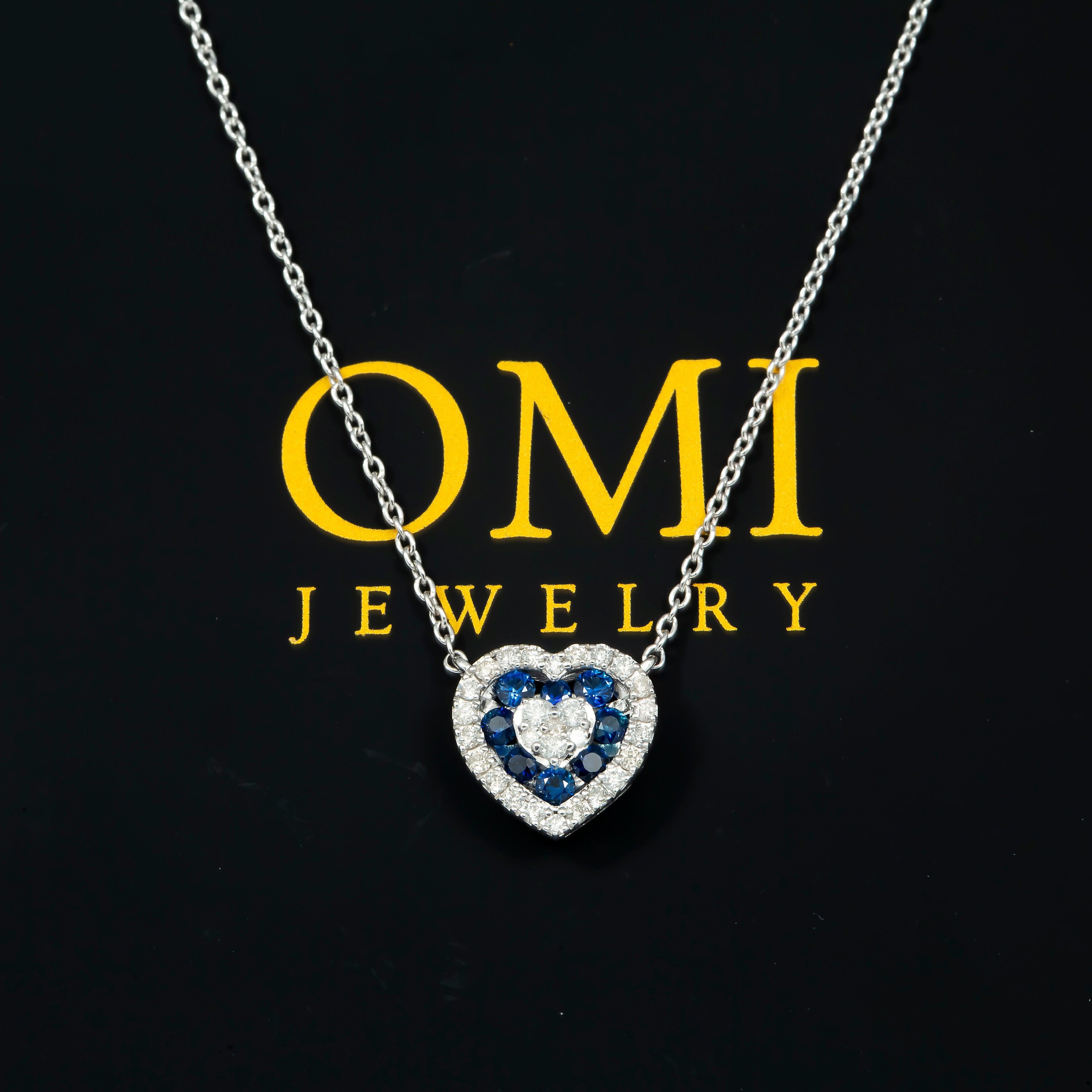 14K GOLD ROUND DIAMOND AND BLUE SAPPHIRE GEMSTONE HEART NECKLACE 0.55 CTW