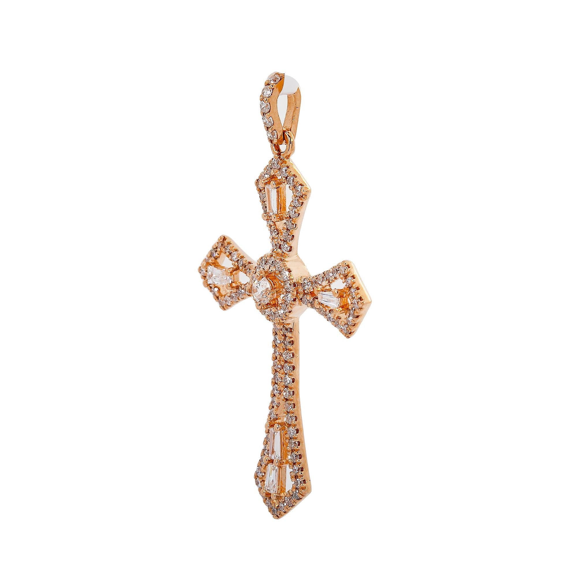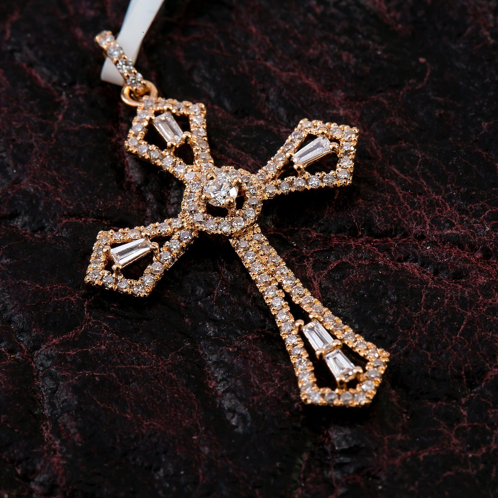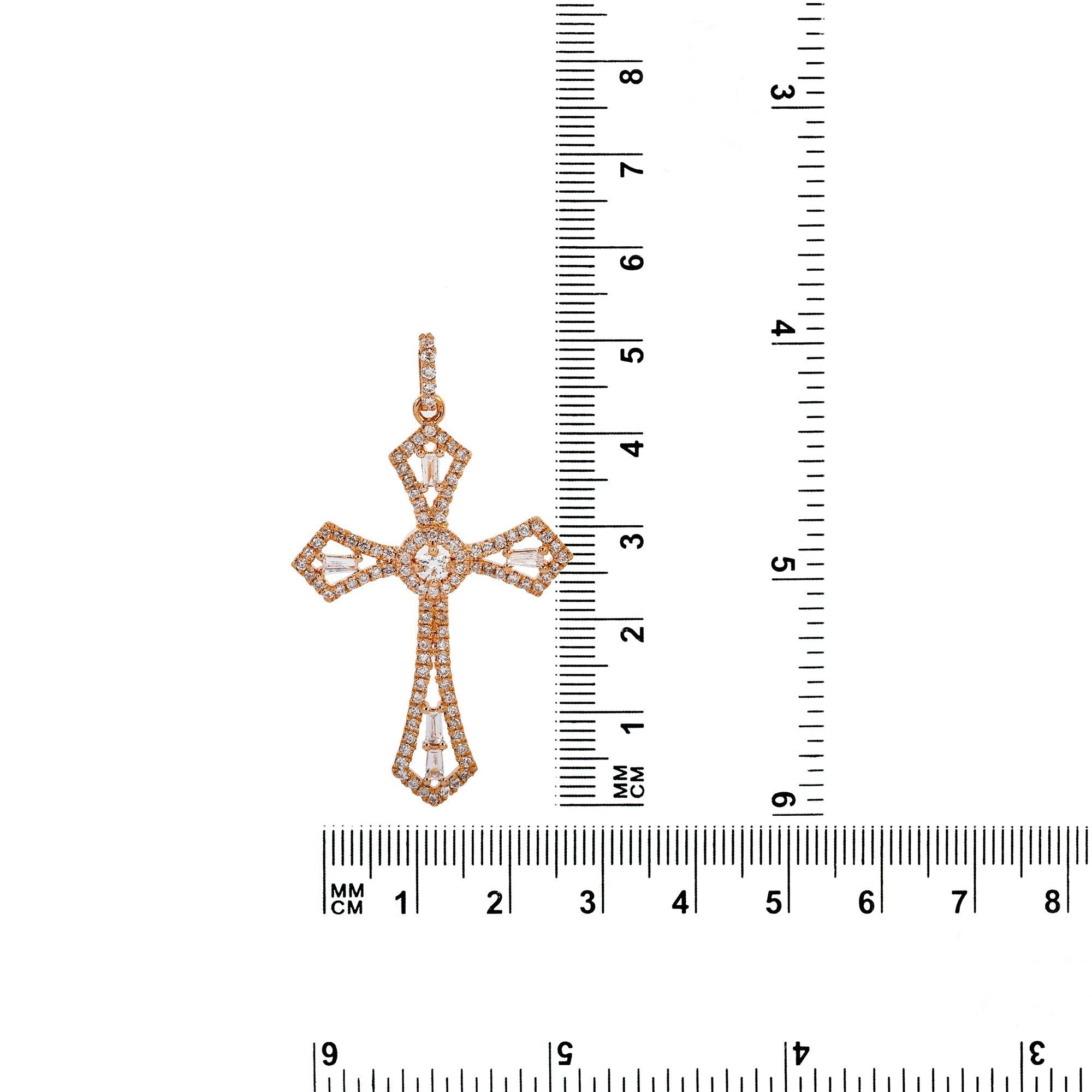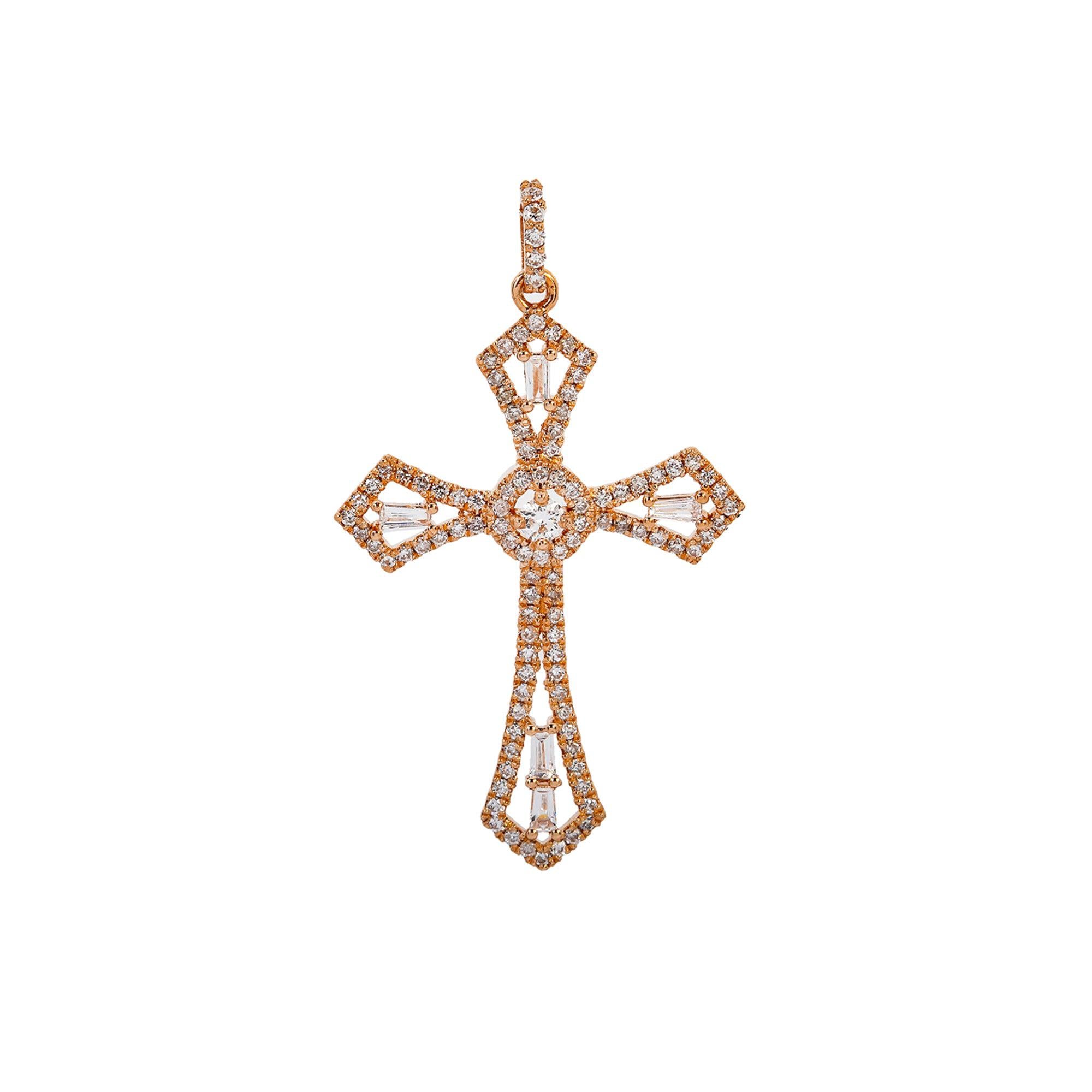 14K Rose Gold Cross Pendant with 0.62 CT Baguette and Round Diamonds