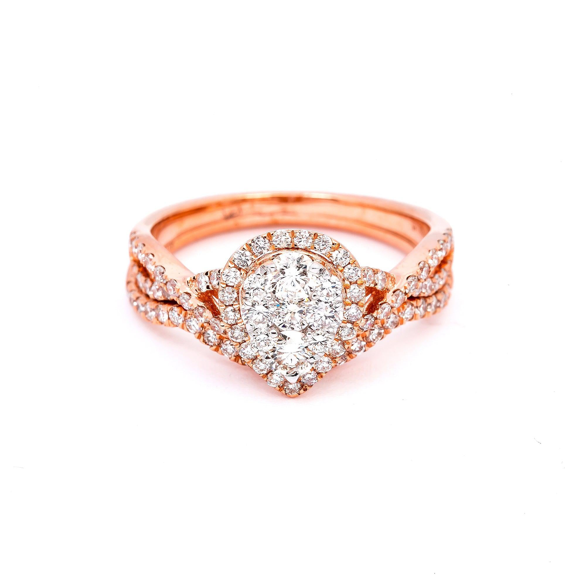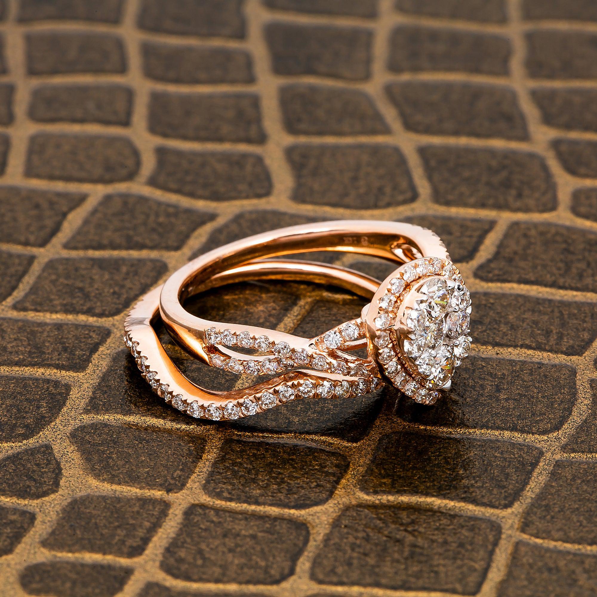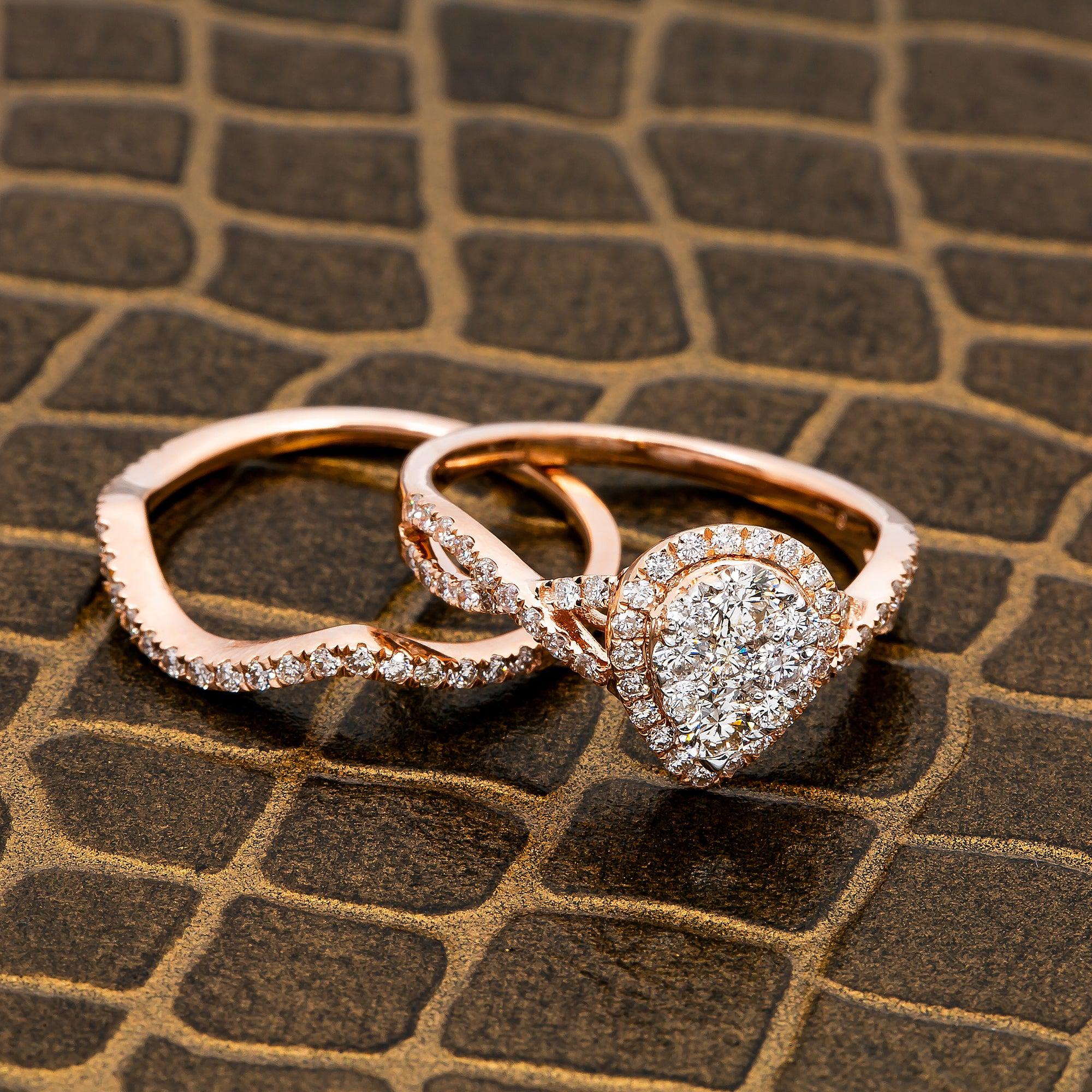14K ROSE GOLD PEAR DIAMOND ENGAGEMENT RING WITH A HALO & 1/2 WAY ROUND DIAMOND WEDDING RING