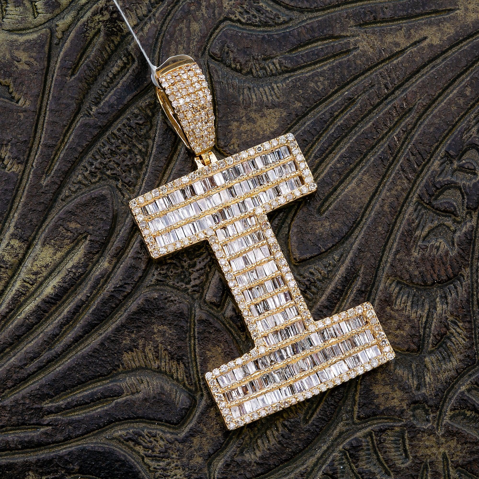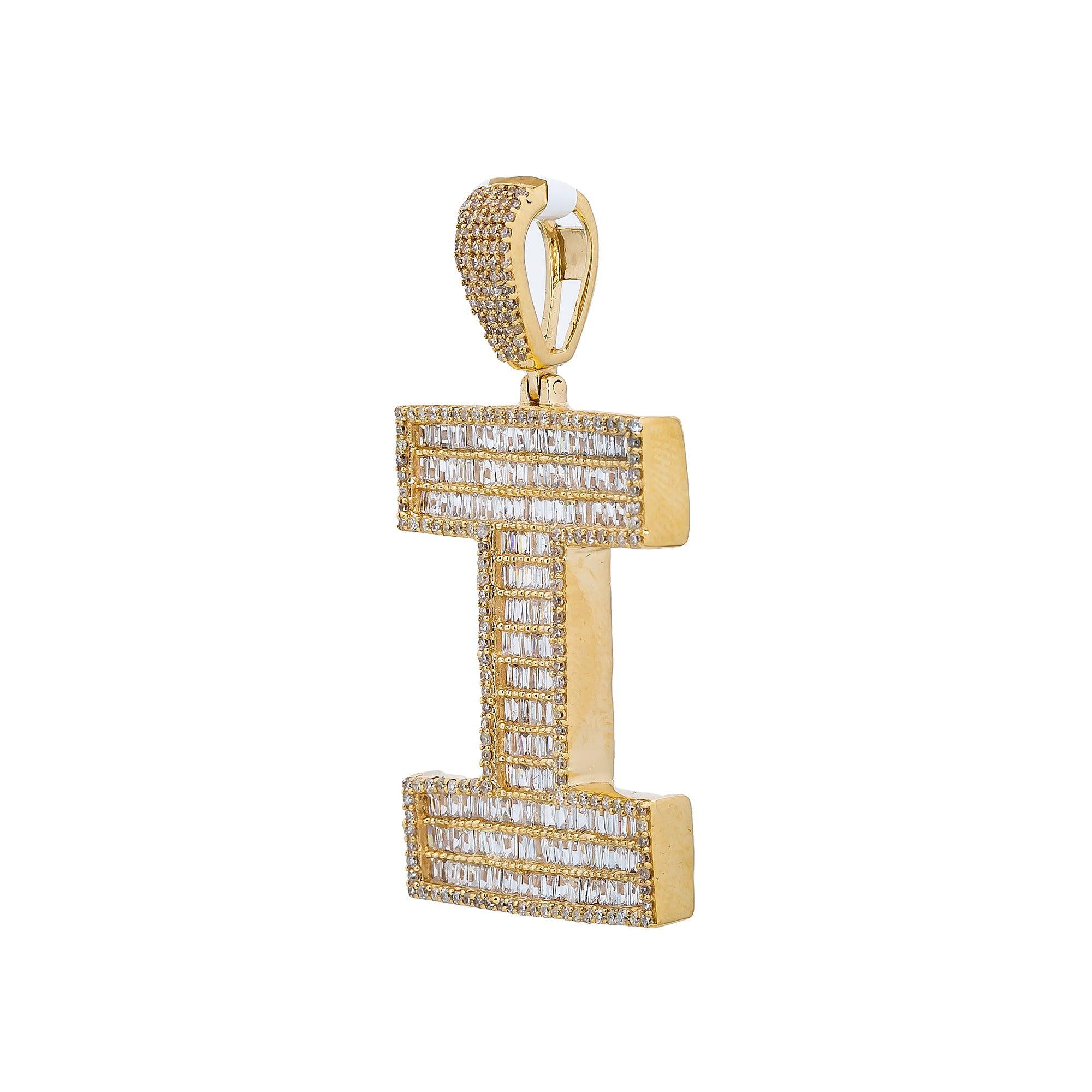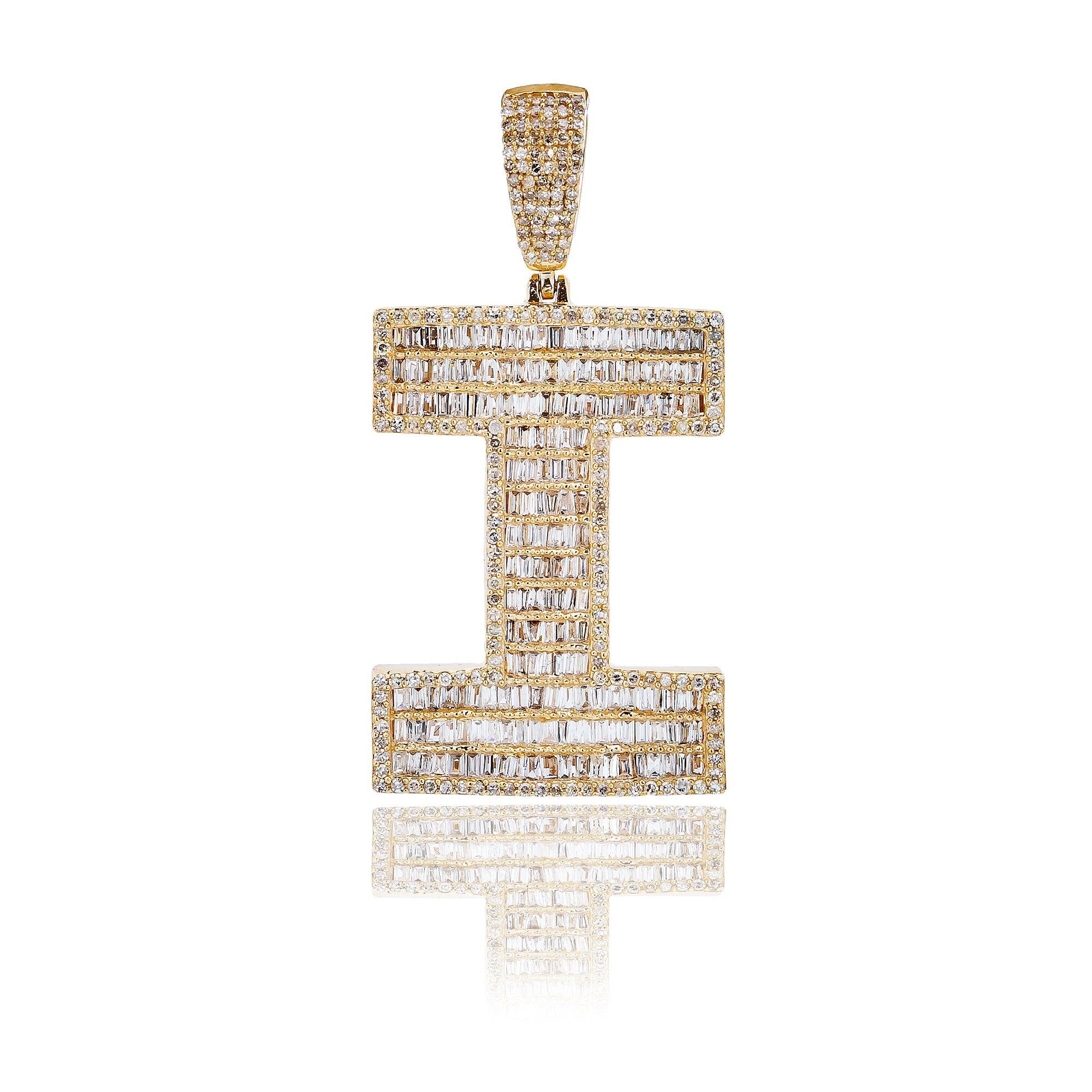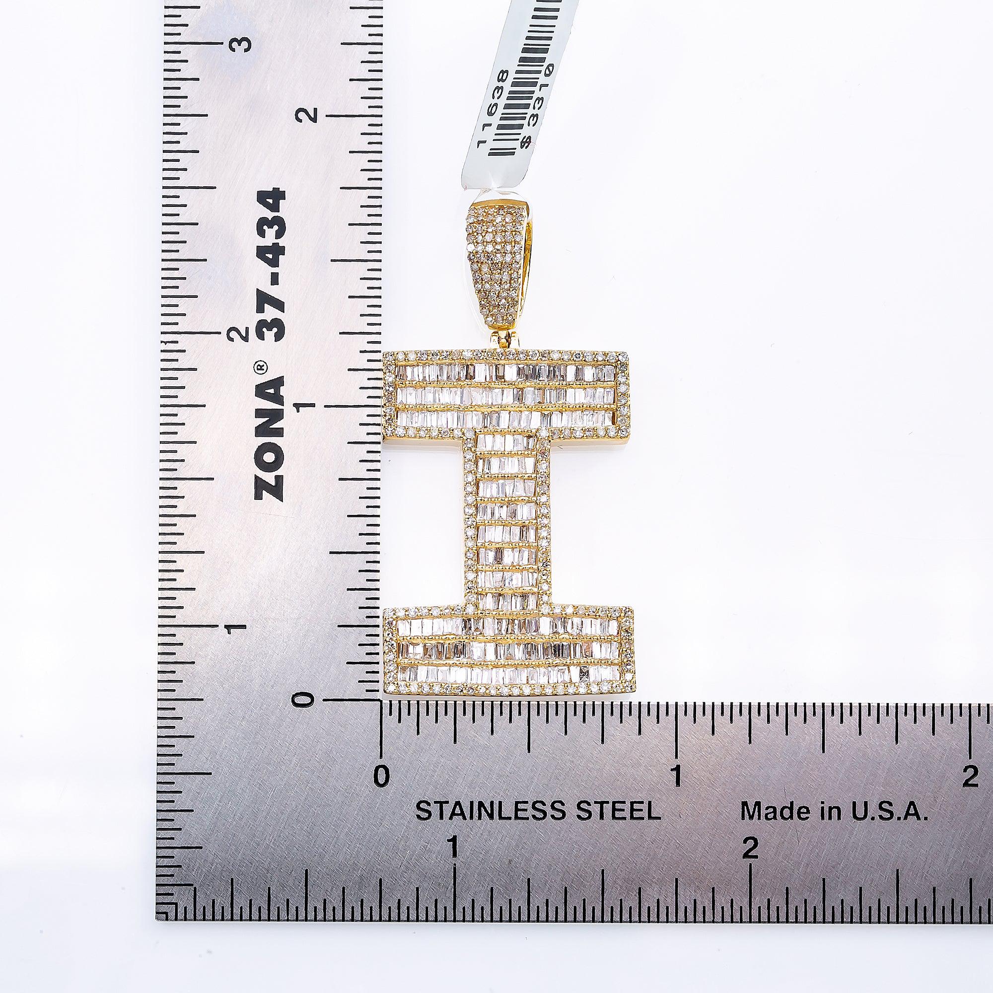 14K Yellow Gold Unisex Letter I Pendant with 1.73 CT Baguette Diamond