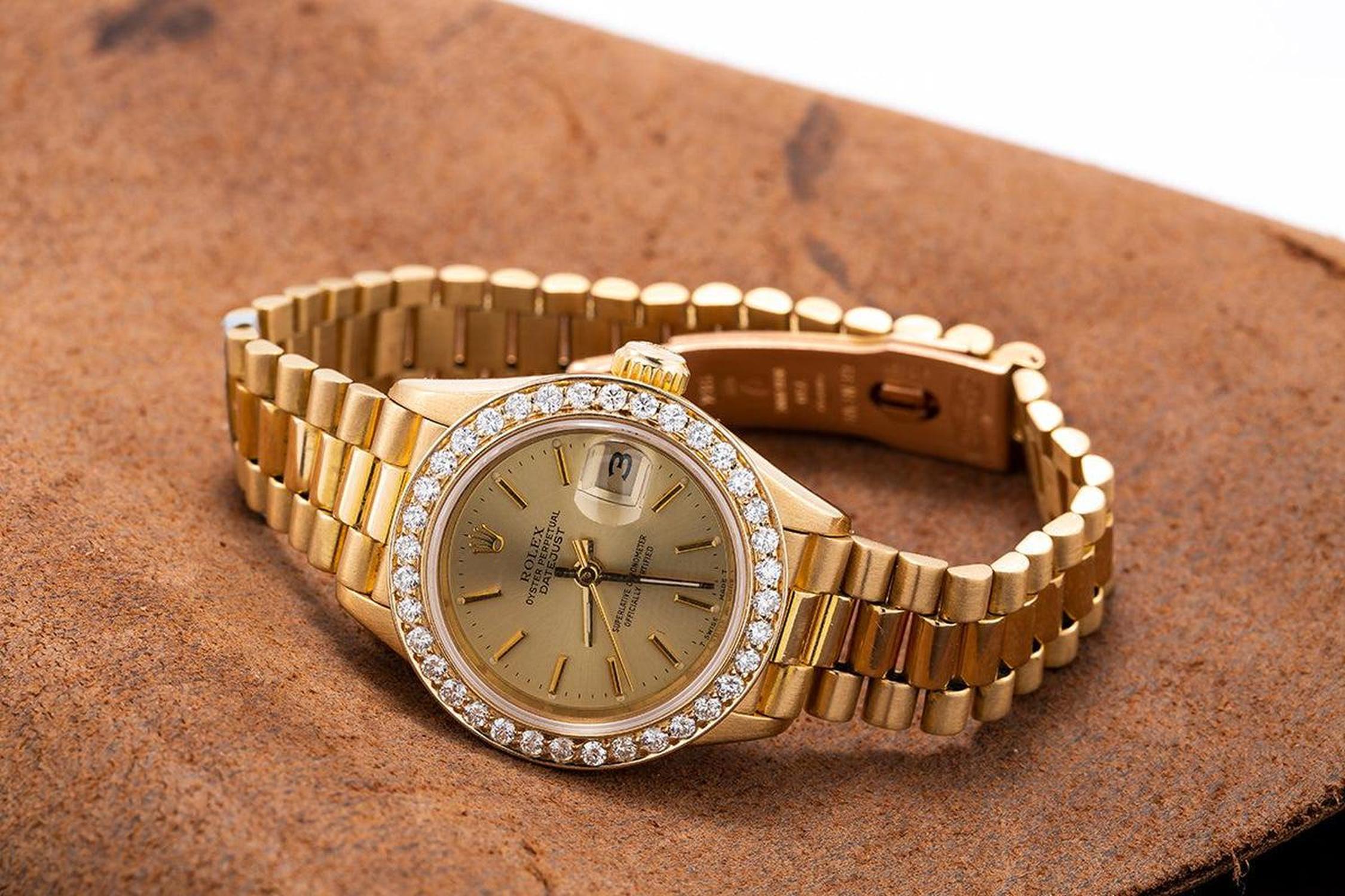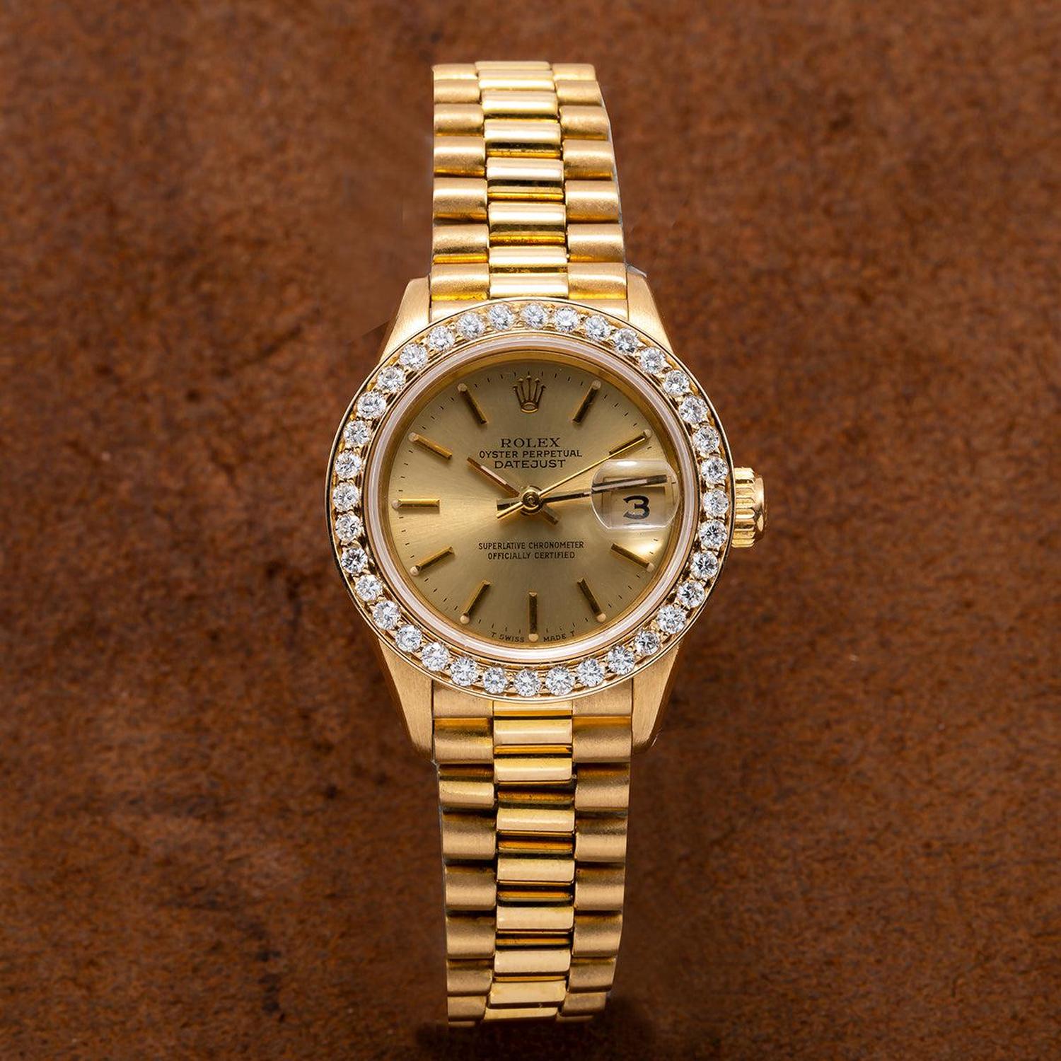 Rolex Datejust 26MM 69178 Champagne Dial Diamond Bezel 18K Yellow Gold President Bracelet 0.8ct