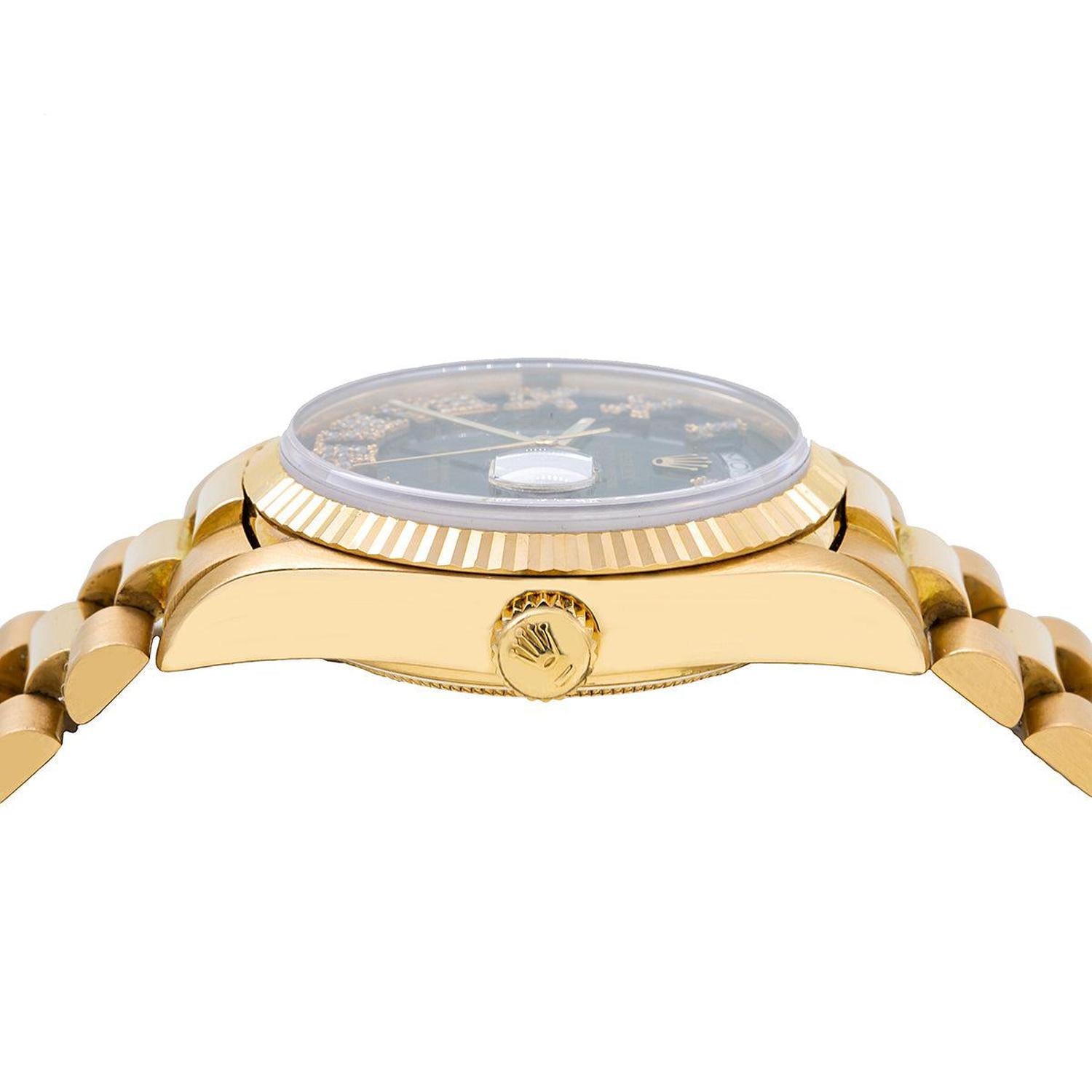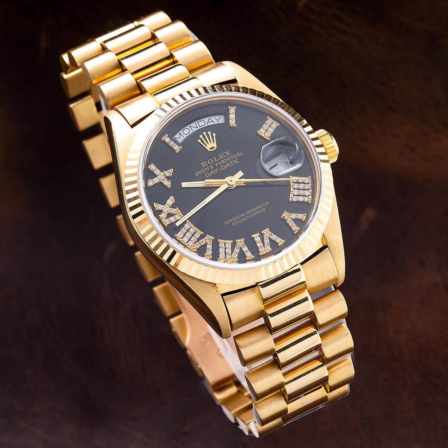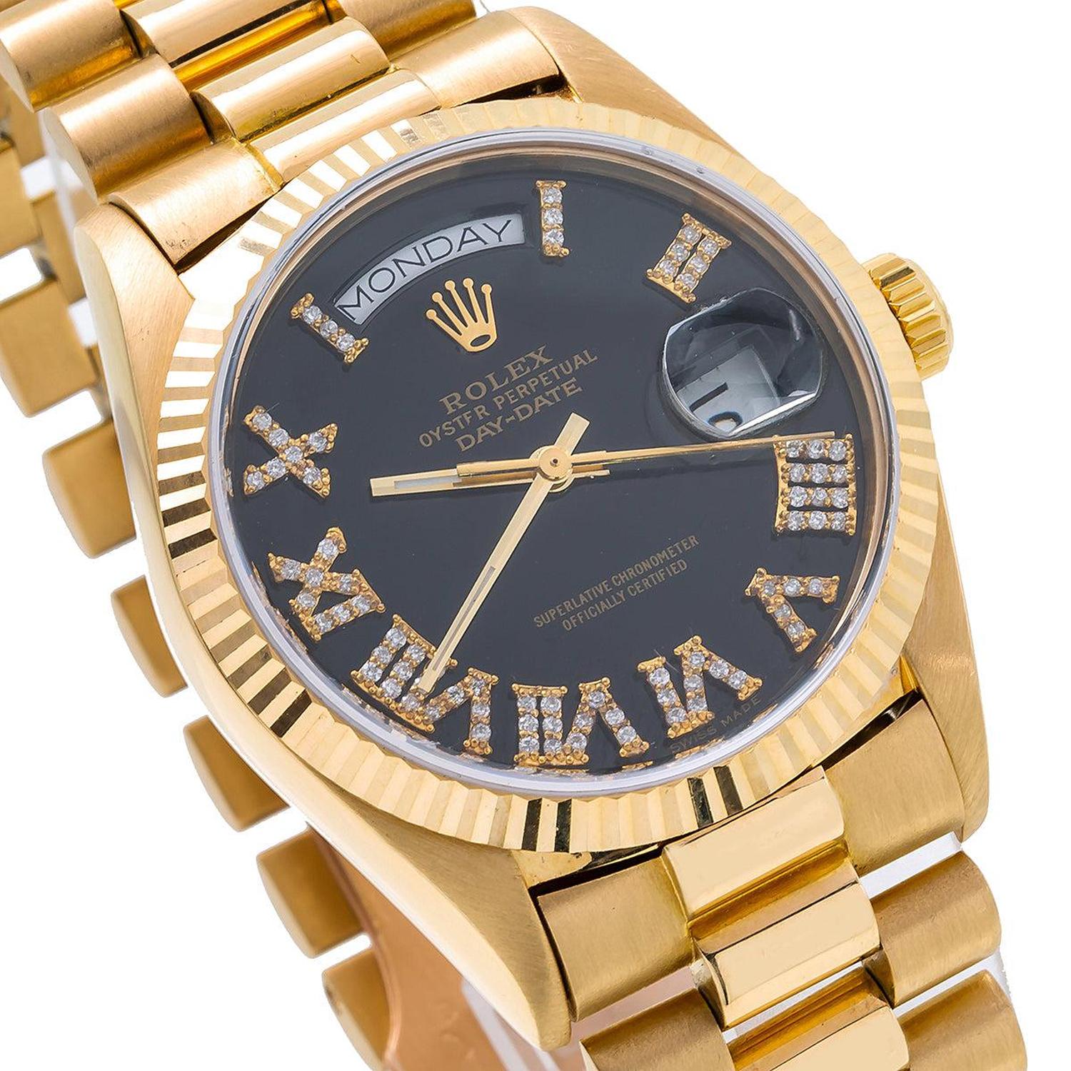 Rolex Day-Date 36MM 1803 Black Roman Diamond Dial Fluted Bezel 18K Yellow Gold President Bracelet