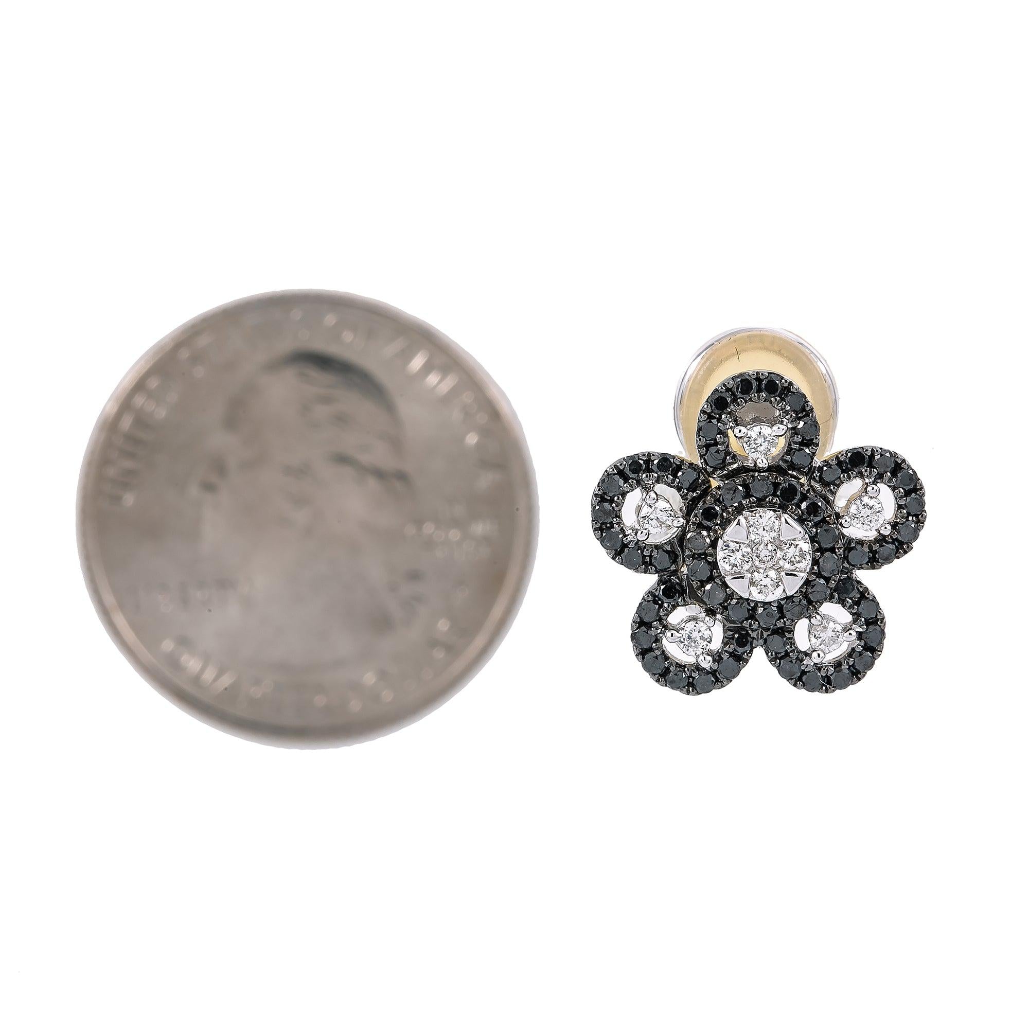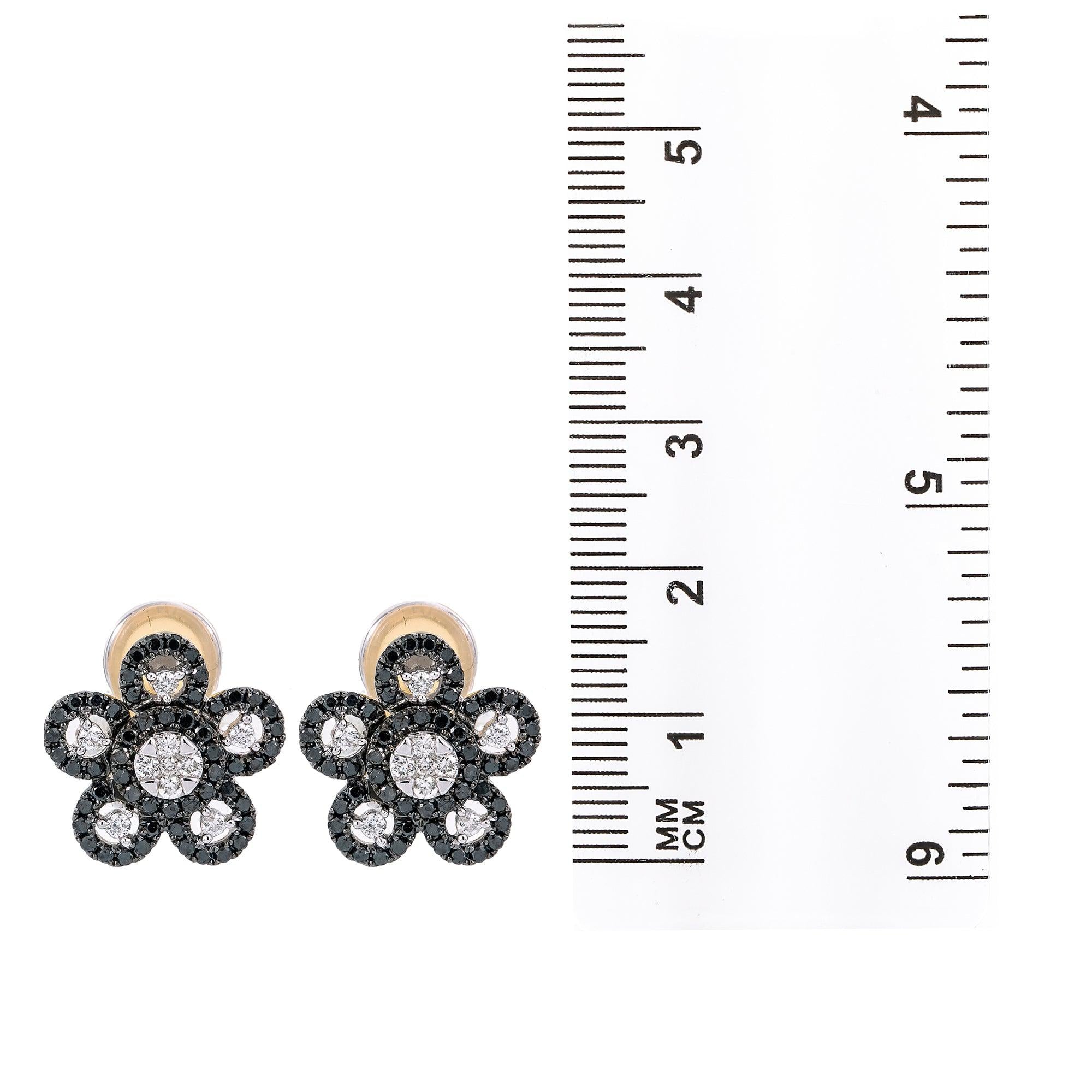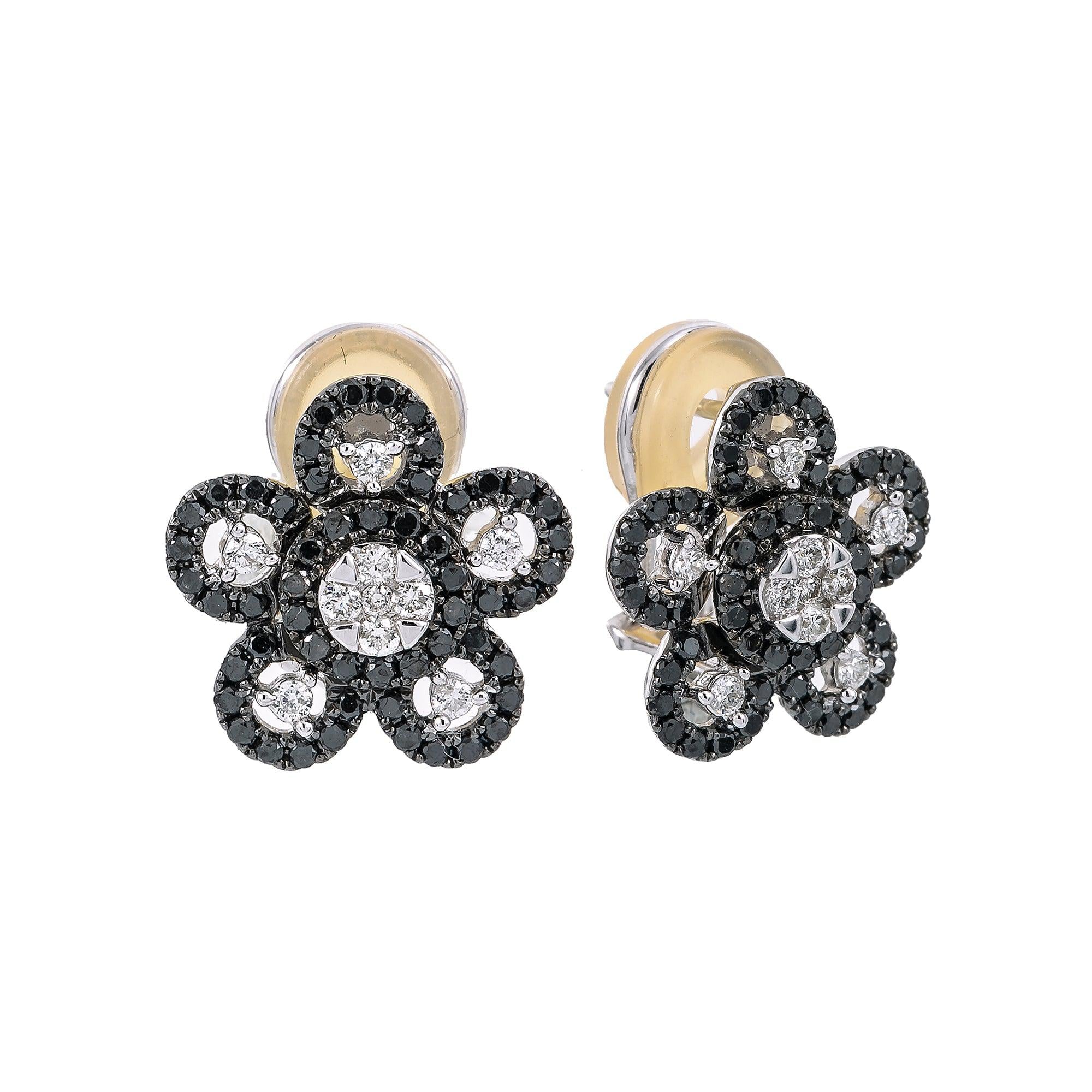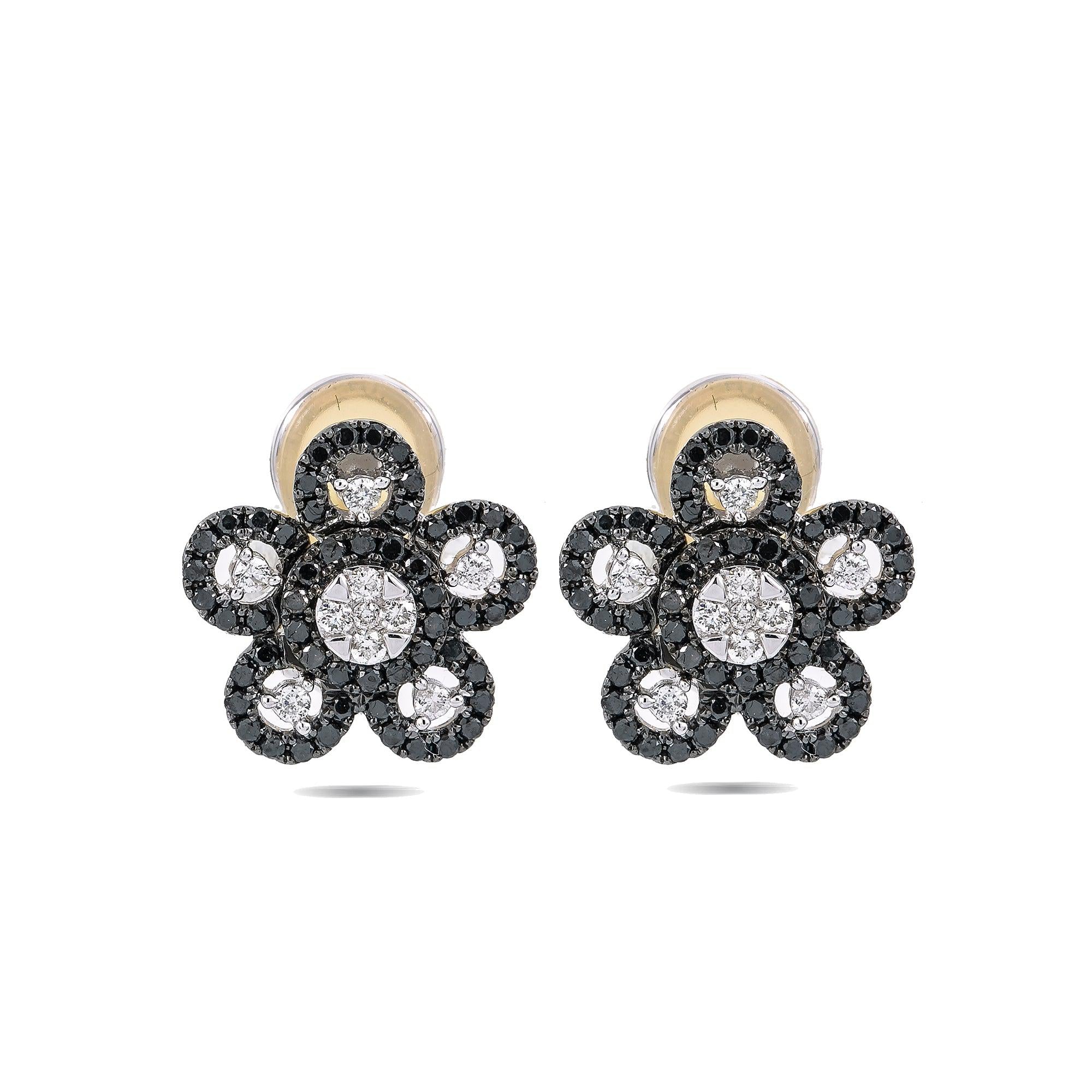18K White Gold Flower Shaped Earrings With White and Black Diamonds