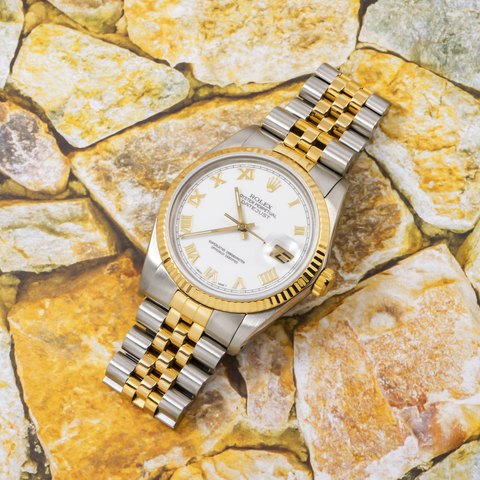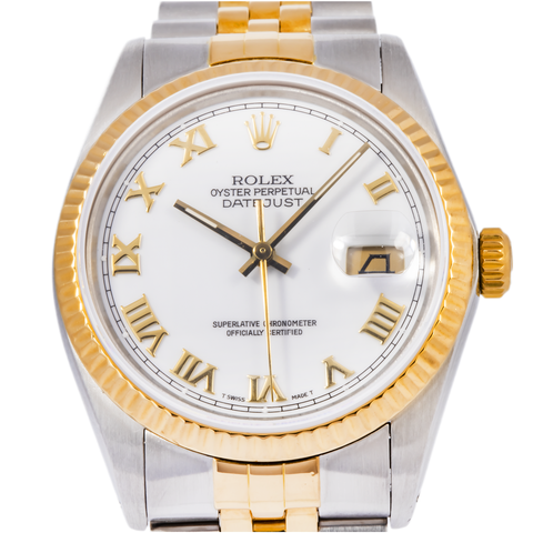 Rolex Datejust 36MM 16013 White Roman Dial Fluted Bezel Two Tone Yellow Gold Jubilee Bracelet