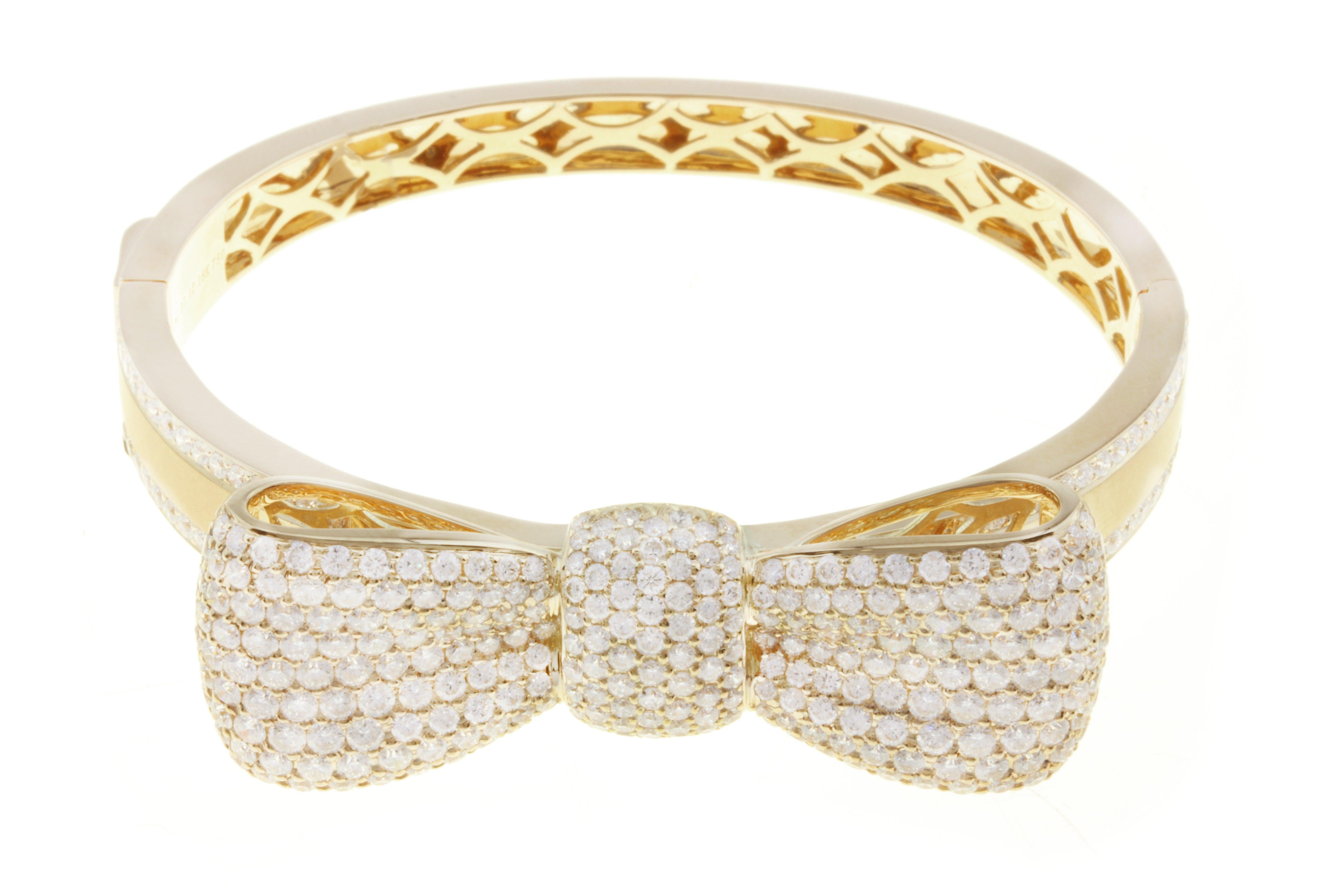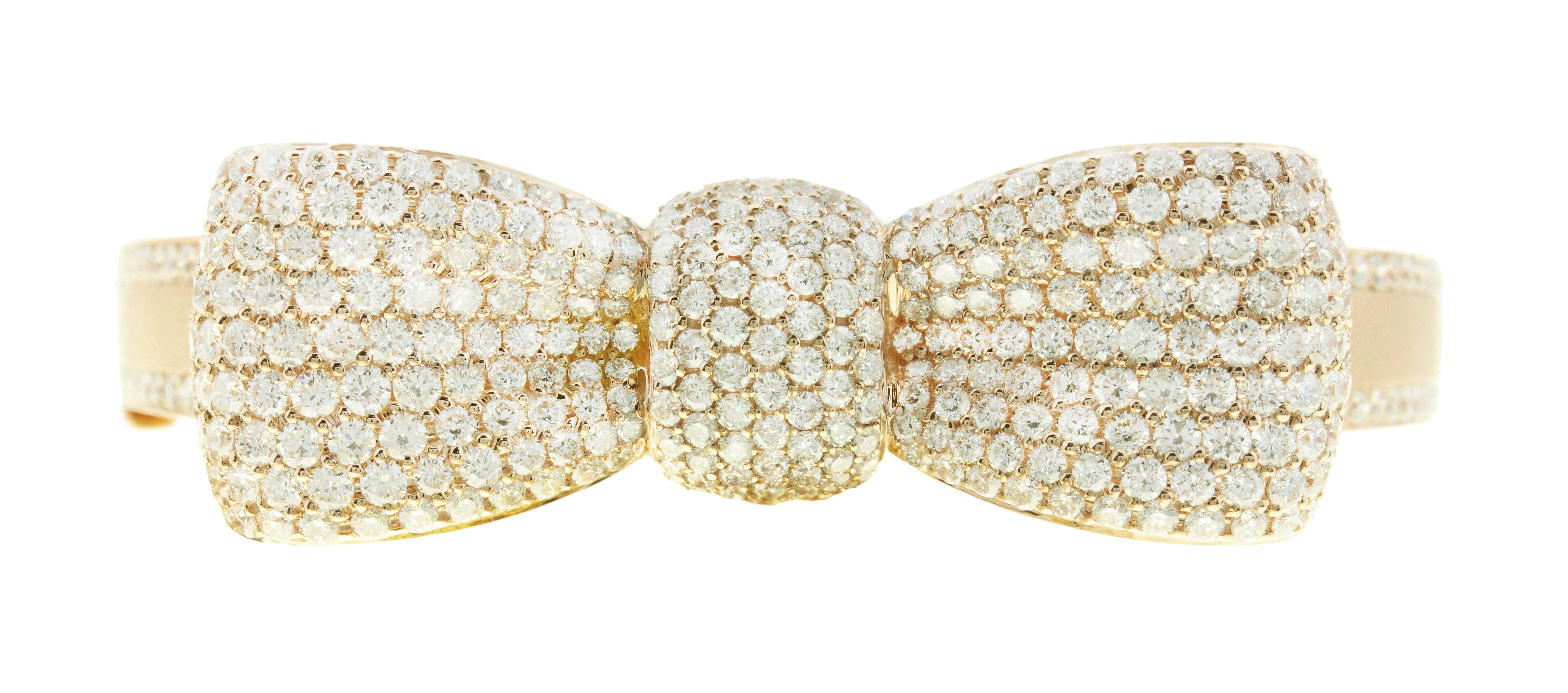 Ladies Diamond Bow Design Bangle. 18K yellow gold set with brilliant round cut diamonds set in a pave setting. Total carat weight is 8.22CT. Bangle weighs 38.51 grams.