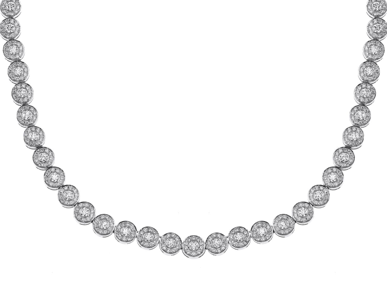 Ladies Diamond Necklace. 18K white gold set with brilliant round cut diamonds set in a pave and bezel setting. Total carat weight 11.00CT. Necklace is about 16 inches long. Weighs 60.16 grams.