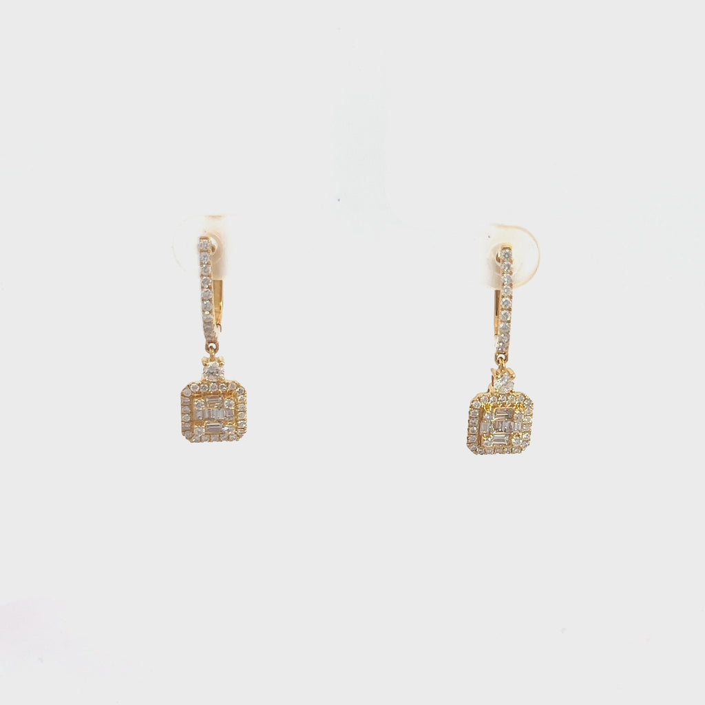 14K GOLD ROUND AND BAGUETTE DIAMOND SQUARE CLUSTER EARRINGS 1.00 CT