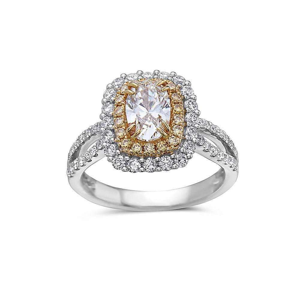 Ladies diamond fancy right hand ring. 18k white gold with brilliant round cut diamonds. as well as a yellow diamonds around the center