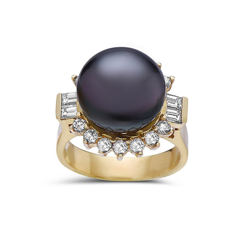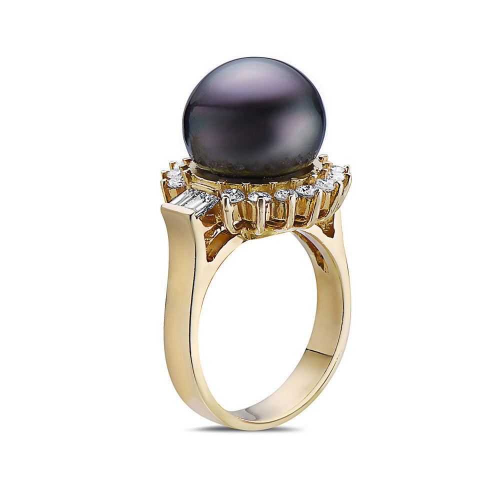 Ladies diamond fashion ring. 18k yellow gold with brilliant round cut diamonds around the outside of the center on both sides. featuring a pearl in center.