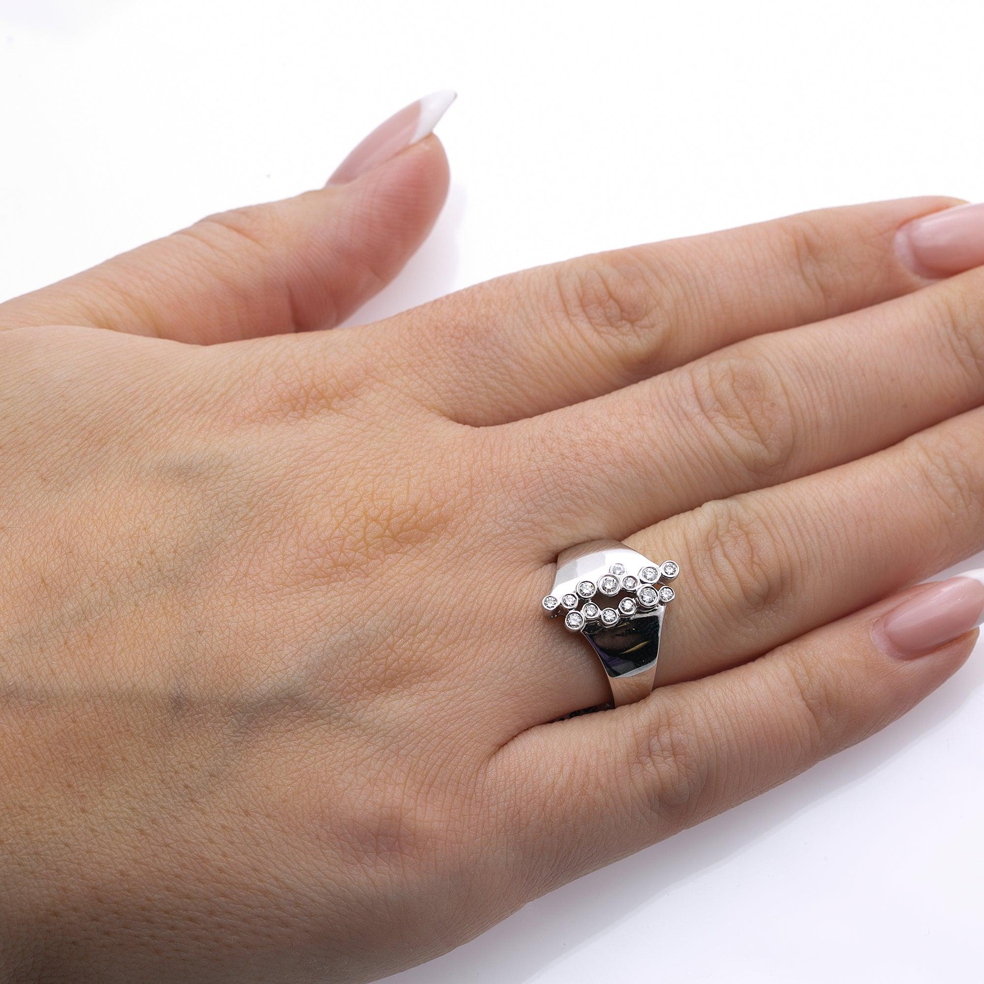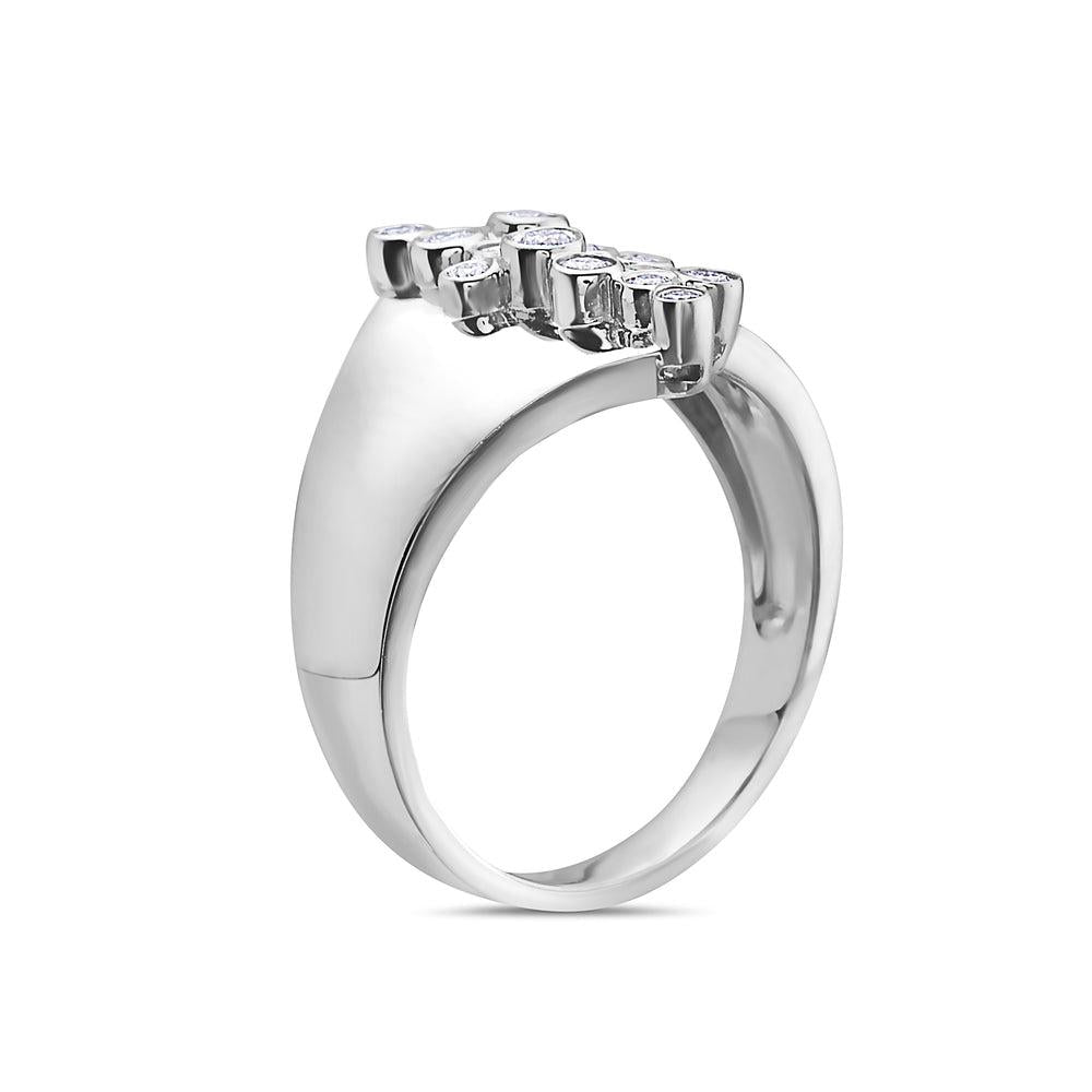 Ladies 18k white gold fancy right hand ring with 14 round cut diamonds in the center.