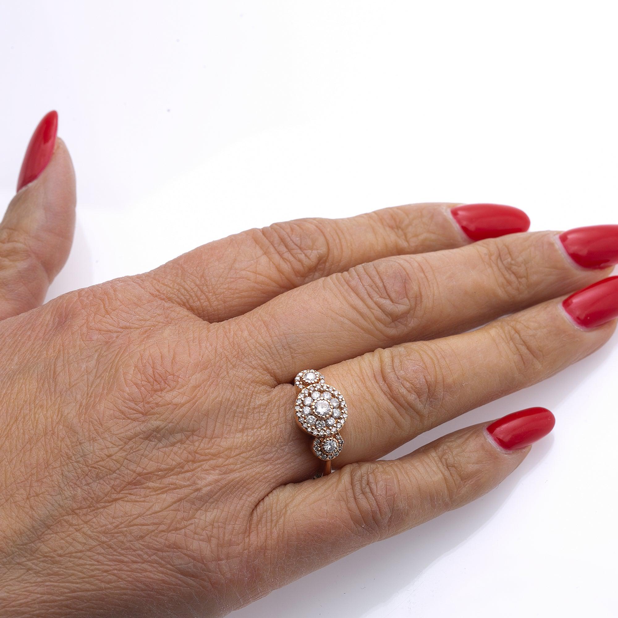 Ladies 14k rose gold fancy right hand ring with round cut diamonds around the center.