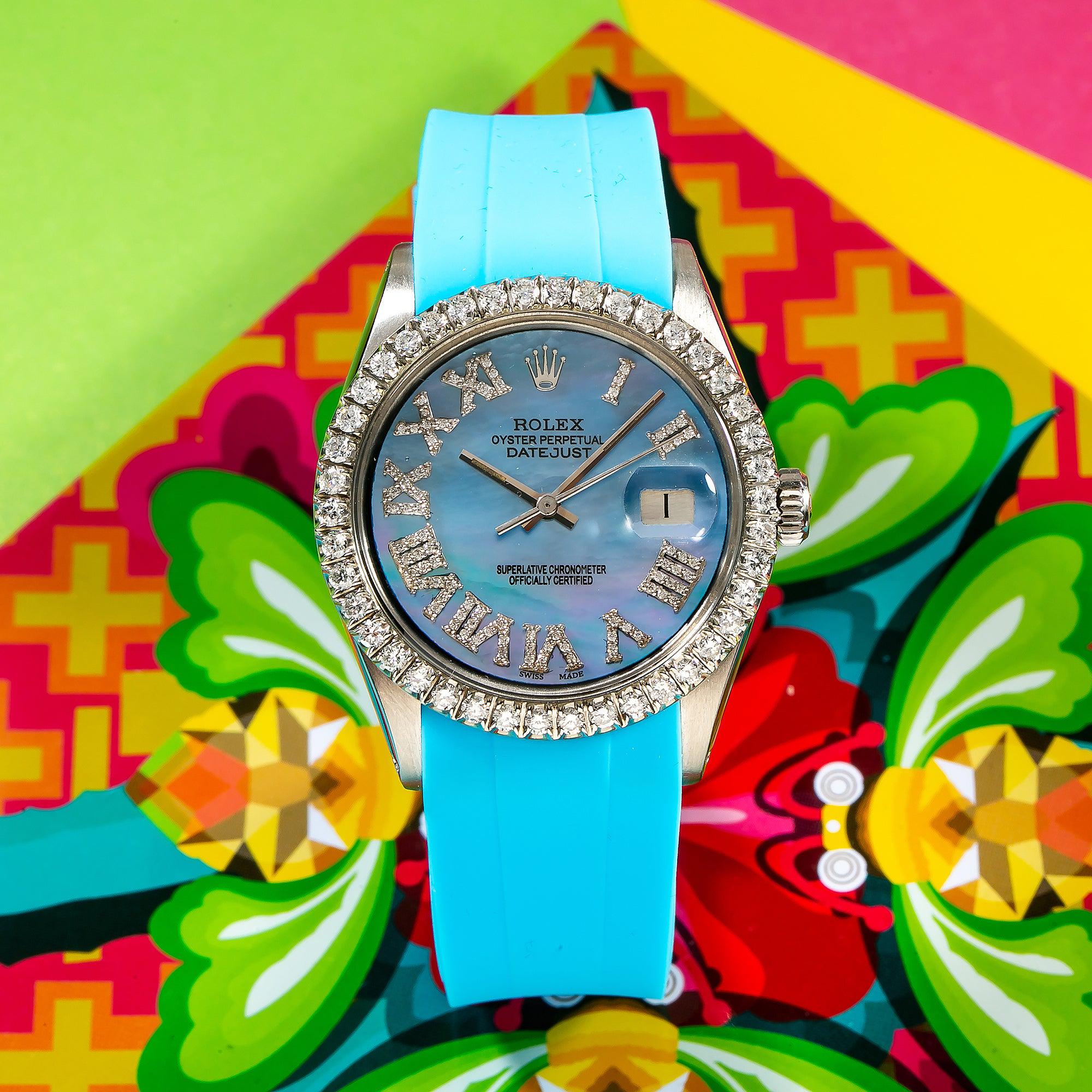 Rolex Datejust 36MM 16014 Blue Mother of Pearl Roman Diamond Dial Diamond Bezel Blue Rubber Strap