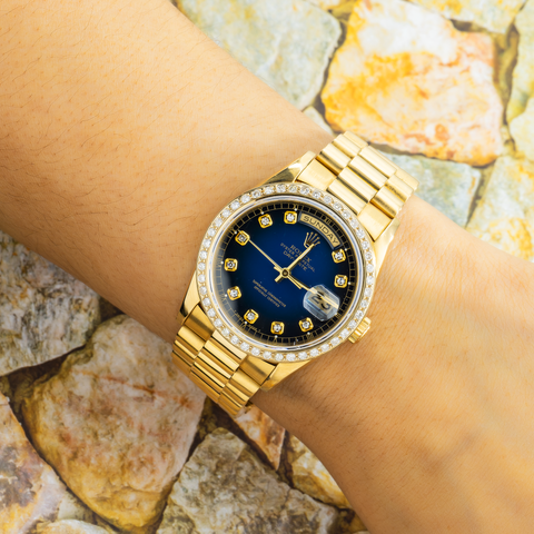 Rolex Day-Date 36MM 18238 Blue Diamond Dial Diamond Bezel 18K Yellow Gold President Bracelet