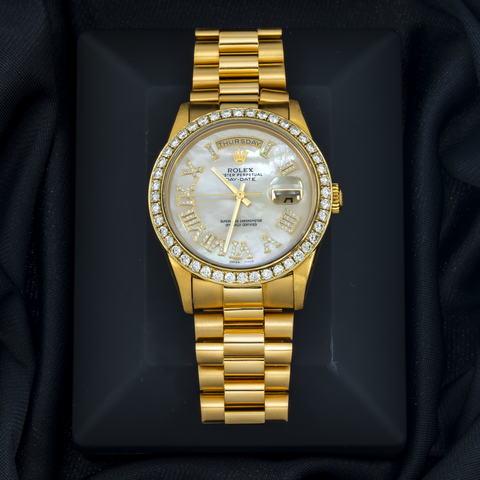 Rolex Day-Date 36MM 18238 Mother of Pearl Roman Diamond Dial Diamond Bezel 18K Yellow Gold President Bracelet