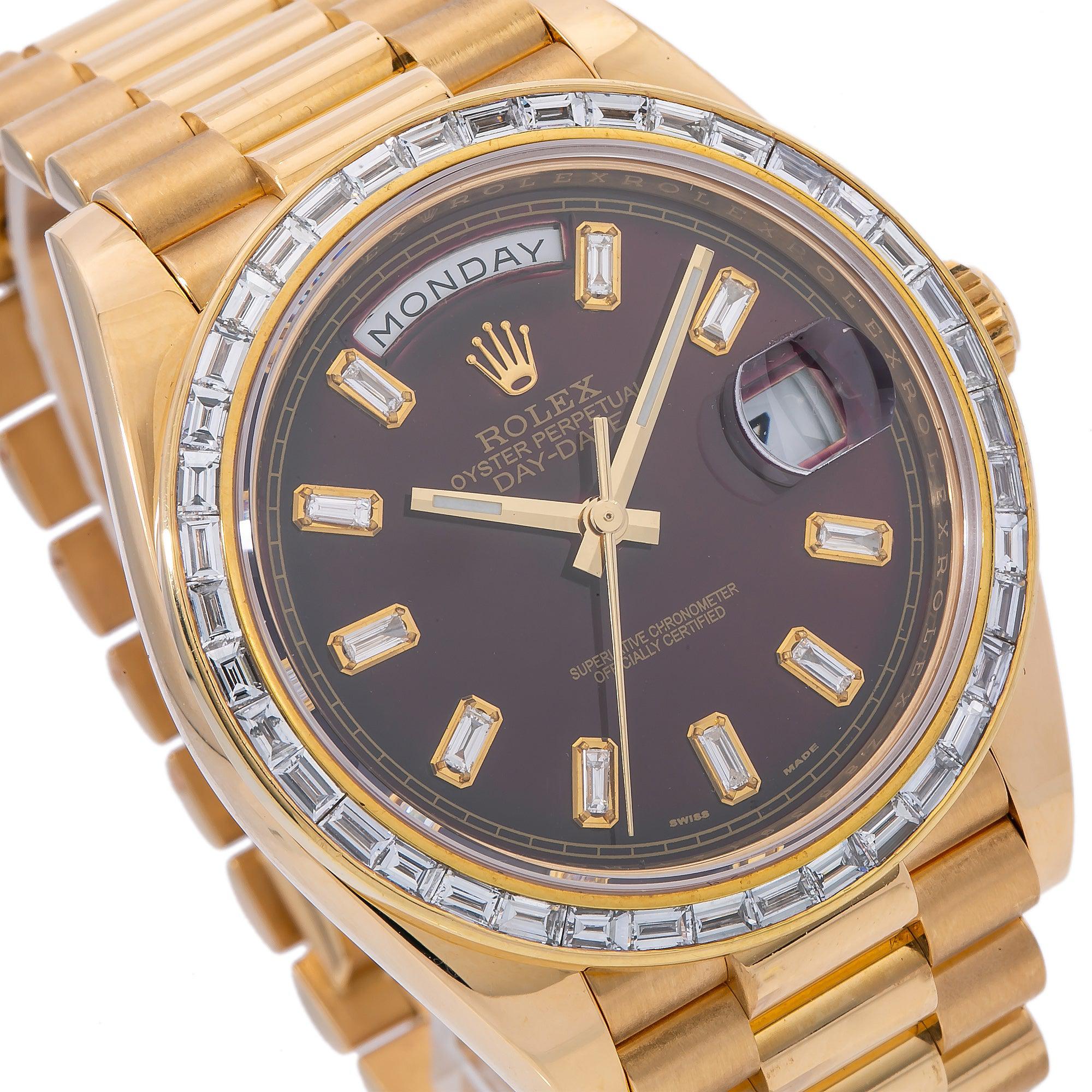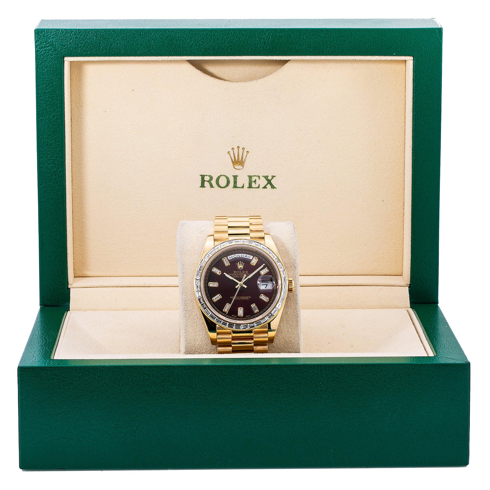 Rolex Day-Date 40MM 228238 Cherry Red Baguette Diamond Dial Diamond Bezel 18K Yellow Gold President Bracelet 4.75ct