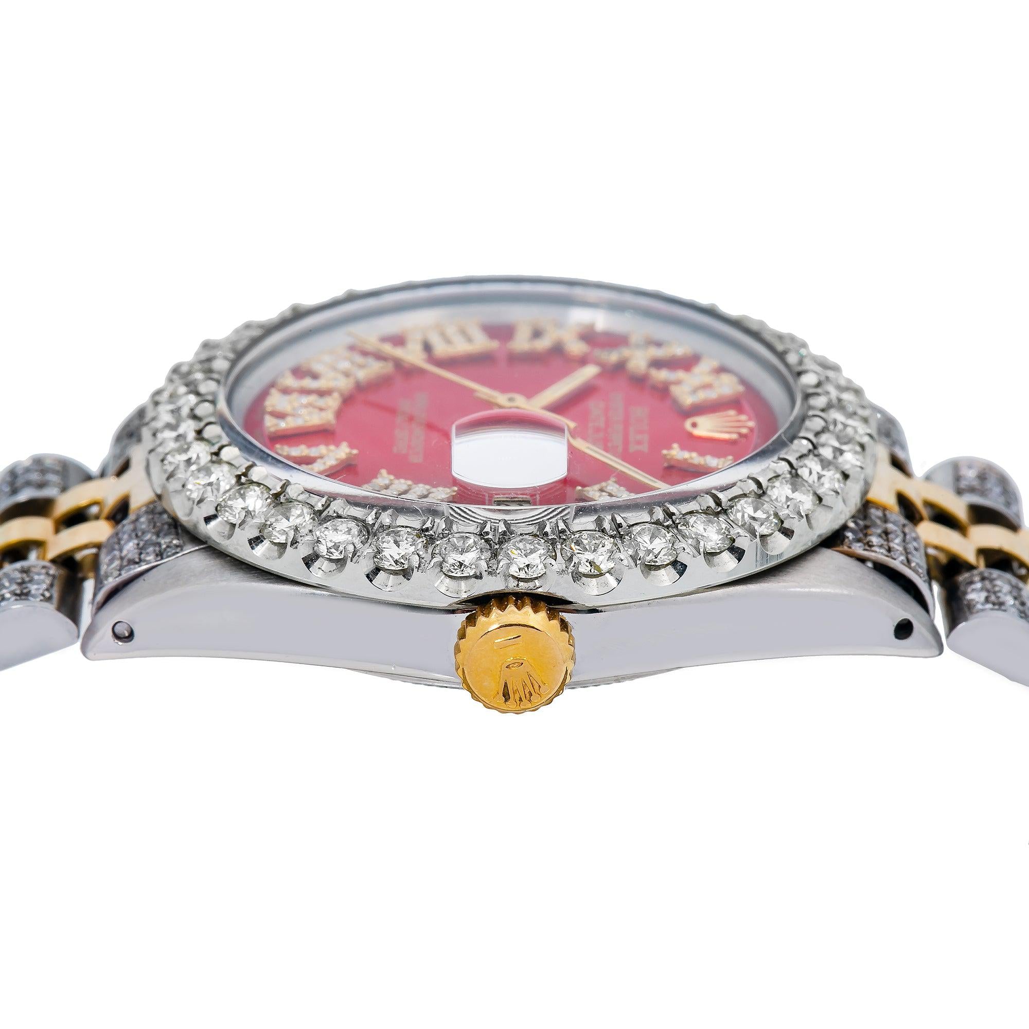 Rolex Datejust 36MM 1601 Red Roman Diamond Dial Diamond Bezel Two Tone Yellow Gold Semi Diamond Jubilee Bracelet