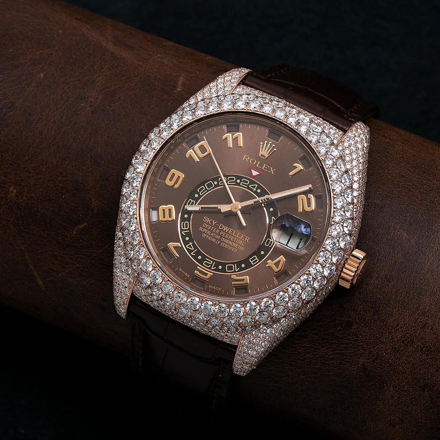 Rolex Sky-Dweller 42MM 326135 Chocolate Arabic Dial Diamond Bezel Brown Leather Strap 15.75ct