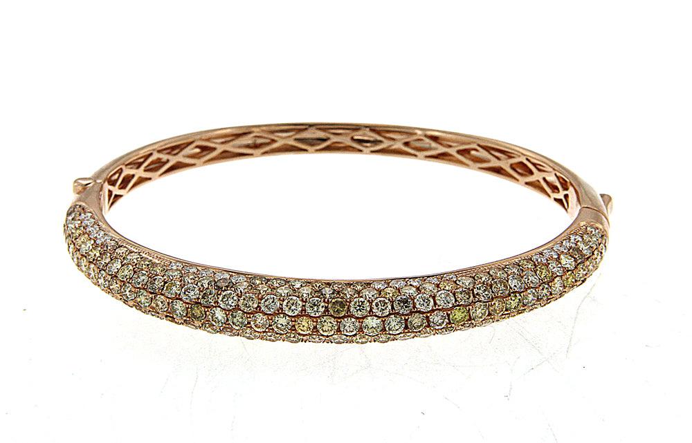 Rose gold jewelry is enchanting as is but when you add crisp white diamonds the look is simply stunning. This diamond bangle bracelet is crafted from 18K rose gold and is meticulously set with over 7 carats of white diamonds and yellow diamonds, a beautiful blend you can't help but love. Amounting to 16.54 grams, this rose gold bracelet is charming and made to last a lifetime. A bangle that has a side closure this rose gold bracelet has dimension and grace. Elegant enough for evening gown attire, this rose gold bracelet is an incredible piece of jewelry that will have all eyes on you!