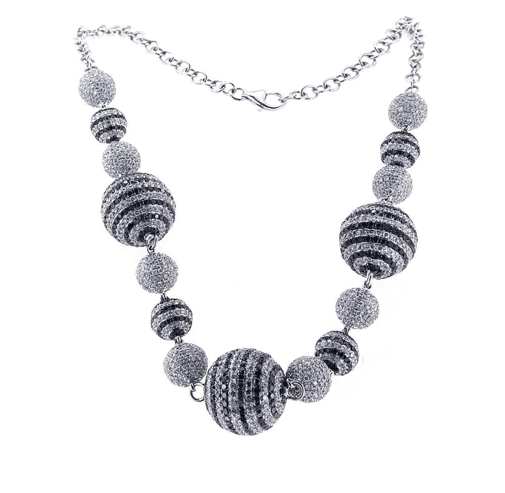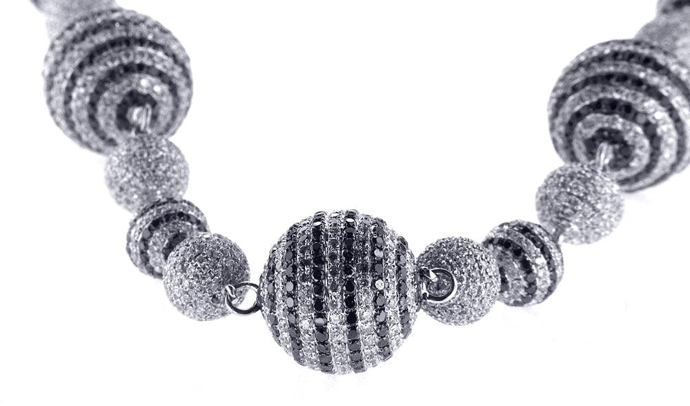 If you are looking to add the perfect statement necklace to your jewelry collection, this is it! Made of 14K white gold this diamond ball necklace is one of a kind. A mesmerizing blend of black and white diamonds that will have all others wishing they were you. A chic pattern of crisp white diamond balls and striped diamond balls with AAA quality black diamonds mixed with white diamonds. The pattern of this diamond necklace is incredible and will have you making the statement of the century. This diamond necklace is perfect for a night out on the town or to wear to your next elegant soiree. Amounting to 58.9 grams, this diamond ball necklace is fierce and fun!