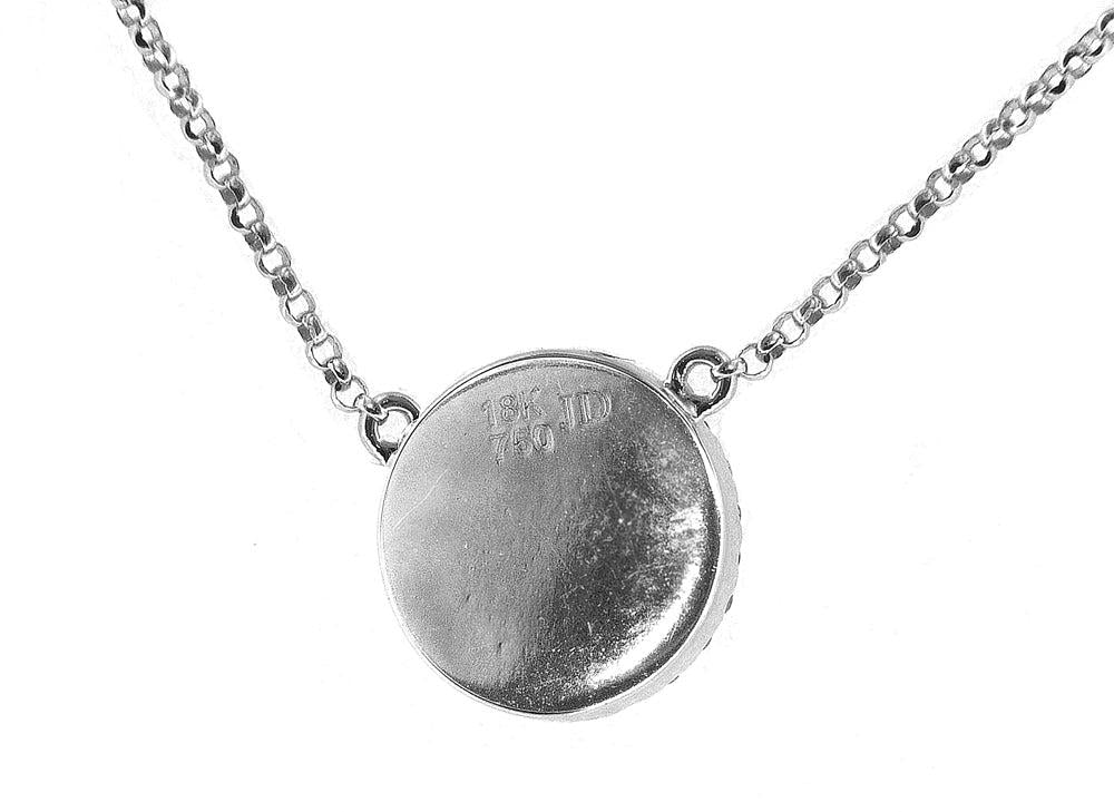A simple design that is undeniably a timeless masterpiece, this 18K white gold necklace would make the perfect addition to any woman's jewelry collection. Taking center stage is a black onyx stone surrounded by meticulously set round cut fine white diamonds. With a total of about 0.20 carats of white diamonds, this white gold necklace for women has the perfect glow. Amounting to 3.78 grams this diamond circle necklace would make an incredible gift. This necklace is versatile and will compliment any ensemble you choose to accessorize with. The white gold chain holds this center pendant beautifully. This would make an incredible gift for any woman of any age!